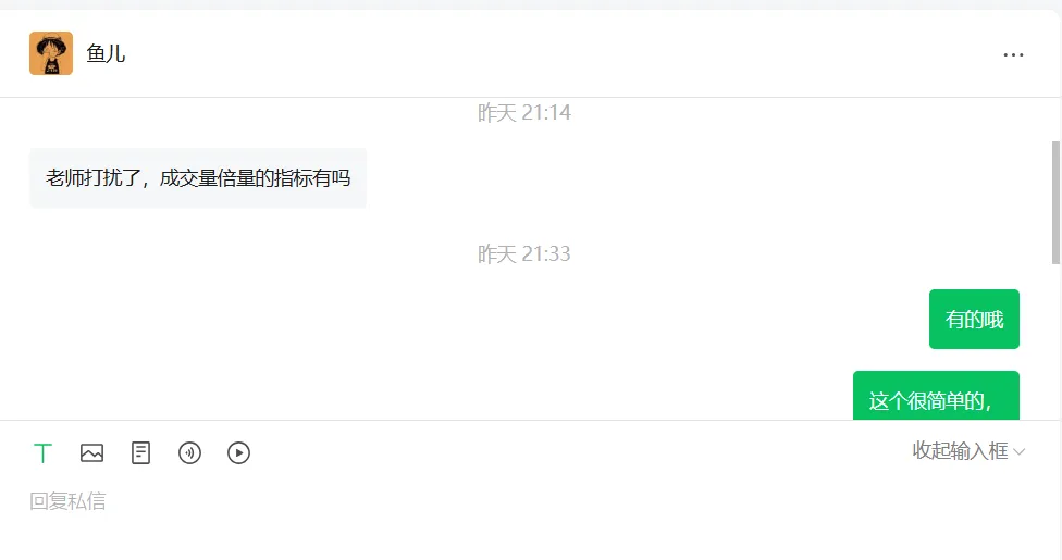 这个指标呢,我一般不会去单独分享的,因为它比较普通且常见,由于这是一位粉丝在后台私信我说:”老师,您这里有倍量指标吗?我说有”!所以,这才制作了一下,但我要让它变得不再简单,经过我的加工优化后呢,在此发布分享给更多的有缘人!
