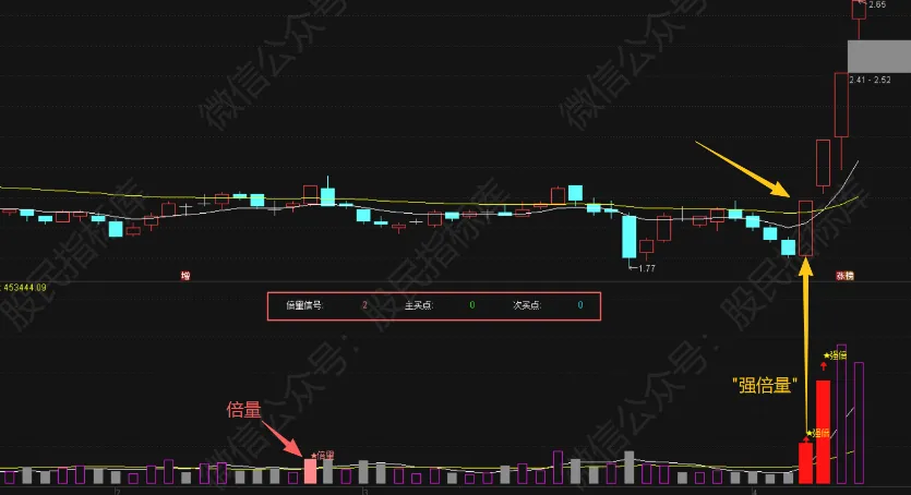 DRAWTEXT_FIX(1,0.41,0.02,0,’倍量信号:’),COLORWHITE;