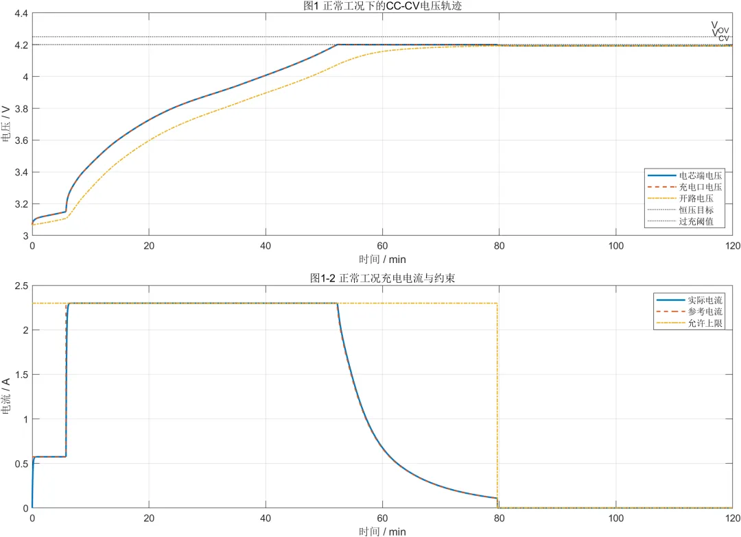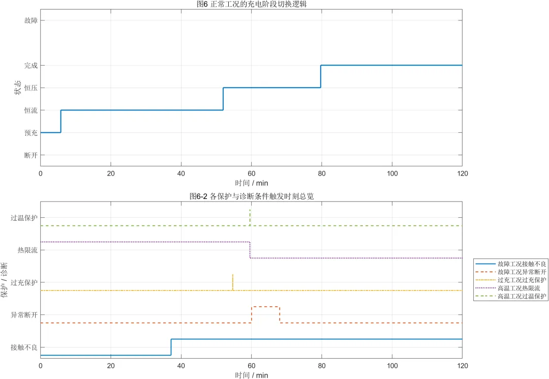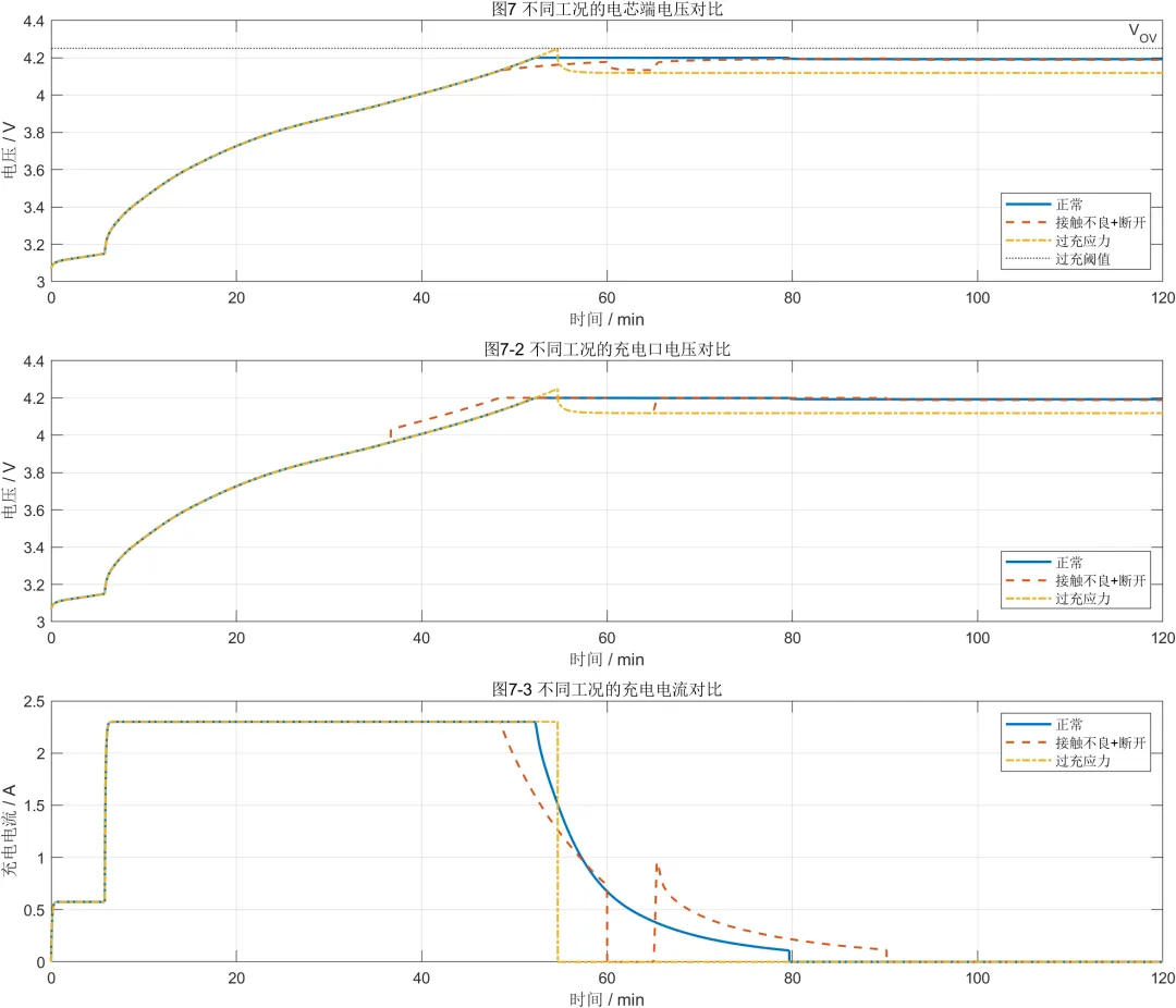对于异常断开工况,本文通过在故障时段内模拟充电器输出中断,并在恢复时设置平滑接管机制,避免了电流重新建立时的突变冲击。该设计使异常断开不仅在电流曲线上可见,也在充电口电压和故障标志中具有清晰表现,从而增强了故障图形与控制逻辑之间的一致性。对于过充保护,本文则通过将电芯电压与充电口电压区分建模,避免了因附加连接电阻导致的端口电压偏差对电芯过充判断造成误导。这一处理对于故障工况尤为重要,因为过充保护应以电芯真实状态为依据,而非被端口异常放大后的表象所主导。相关研究指出,模型可解释性与安全逻辑一致性,是电池故障诊断从“能检测”走向“能可信使用”的关键。
