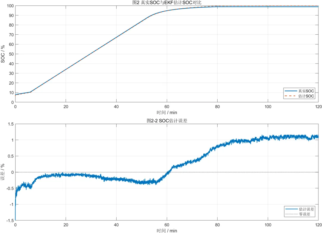本文在SOC估计部分采用模型驱动的滤波估计思路,并在估计过程中引入测量噪声与轻微参数失配,使其结果更接近真实BMS应用情形。这样做的目的不是人为降低估计性能,而是避免出现与真实系统脱节的理想化结果。仿真结果显示,估计SOC能够较好跟踪真实SOC变化趋势,误差始终处于较小范围内,能够满足充电控制与保护判断的需要。与完全理想模型相比,引入噪声和参数偏差后的估计结果更具工程参考意义,也更能体现SOC估计算法在正常工况下的稳健性。有关研究表明,状态估计的工程有效性不仅取决于算法本身,还取决于模型与传感器不确定性是否被合理考虑。