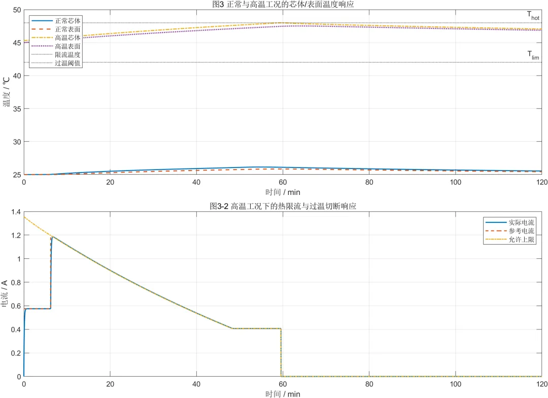 基于上述认识,本文在热学部分引入芯体温度与表面温度两个状态量。芯体温度主要反映电芯内部热积累,表面温度则更接近传感器可测量量。二者之间通过热阻与热容形成耦合,并通过对环境散热建立热交换关系。该结构虽不追求复杂空间分布,但足以表征充电时的主要热行为。为了兼顾工程表达和控制可实现性,本文设置热限流阈值与过温切断阈值两个温度门限。当前者被触发时,允许电流按降额曲线下调,以降低发热功率并延长可安全充电时间;当后者被触发时,则直接停止充电,以阻断热失控风险进一步累积。热管理与热传导研究普遍表明,锂离子电池充电安全并不取决于单一最高温度值,而与温度分布、温升速率、散热条件和持续时间密切相关,因此在控制中引入热限流与过温切断的双层门限是合理的。