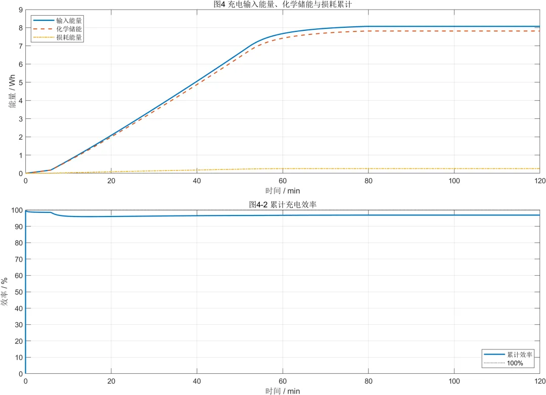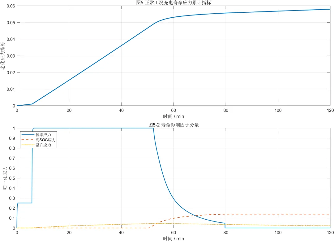 除了状态估计,本文还对充电效率和寿命应力进行了评价。充电效率通过输入能量、化学储能和损耗能量之间的对比进行描述,从而反映不同阶段中能量转化质量;寿命应力则从倍率应力、高SOC停留应力和温升应力三个角度进行归一化表征,以刻画充电过程中可能诱发容量衰减和内阻增大的主要风险来源。相关研究指出,较高充电倍率、较高工作温度和较长的高SOC停留时间,都会加速电池老化;同时,合理的充电策略和温度管理有助于在充电时间与寿命之间取得折中。基于此,本文将效率与寿命应力评价纳入统一仿真框架,使得模型不仅能回答“能否安全充电”,还能够进一步回答“这样充电是否经济、是否有利于寿命保持”的问题。