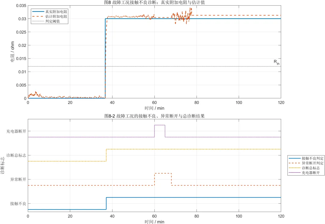 本文对接触不良的判定采用了基于附加电阻反演的思路。具体而言,通过比较充电口电压与内部等效模型所估计的电芯电压,在充电电流已知的条件下,可将二者之间的额外压差换算为附加连接电阻。该量一旦持续高于阈值,即可判定存在接触不良风险。与单纯依赖电压跳变或电流异常的判据相比,这种方法具有较好的物理解释性,也更容易与控制和保护逻辑衔接。为避免低电流区估计失真,本文对低电流时段采取估计冻结与平滑处理,使诊断结果在完成阶段和异常断开阶段仍保持合理稳定。仿真结果表明,诊断模型能够较为清楚地分辨正常连接与附加电阻故障两类工况。