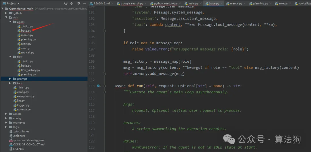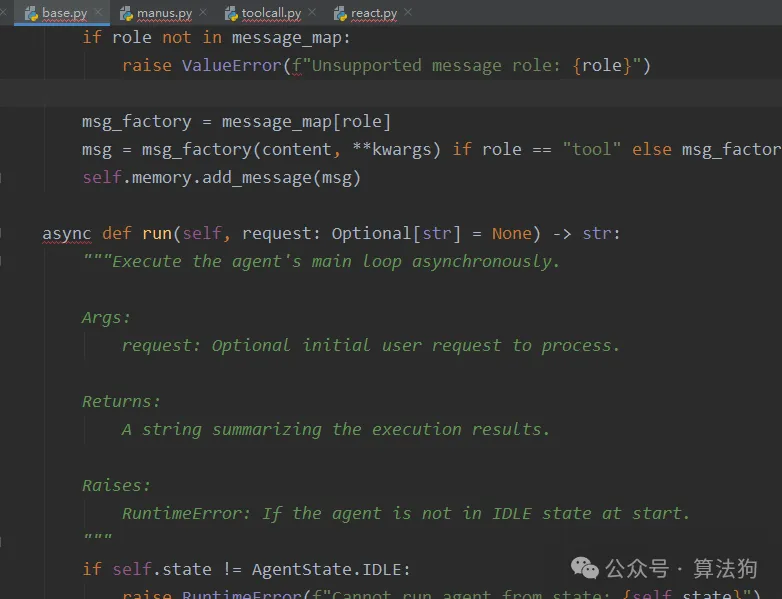 调用.run函数,查看代码结构,发现.run函数在base.py里面的BaseAgent里面