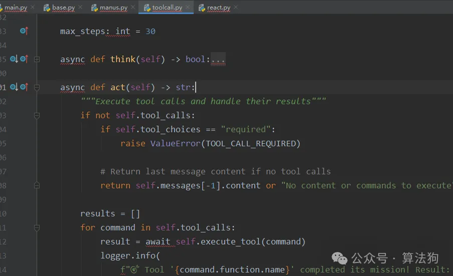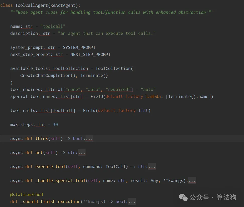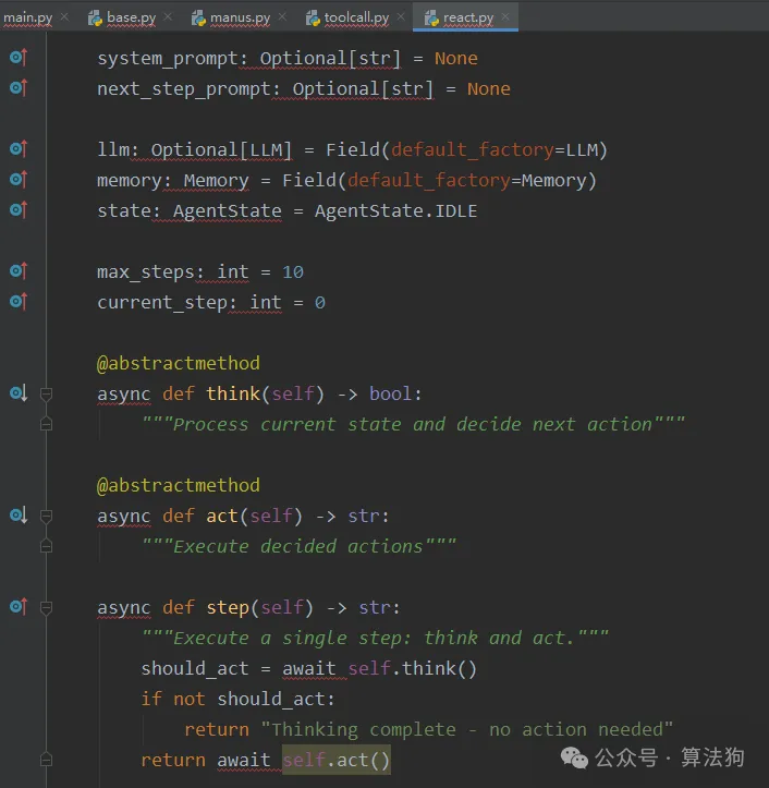 这个类是比较重要的,是一个基于 ReAct(Reasoning and Acting)框架 的代理类。它通过交替进行 思考(Think) 和 行动(Act) 来完成任务。具体来说: