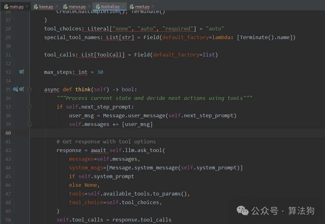 父类是ToolCallAgent,顾名思义ToolCallAgent就是工具调用的agent,当然,Manus这个类里面还有很多参数,我们有时间继续看