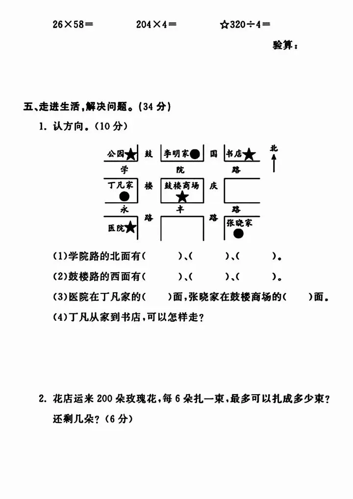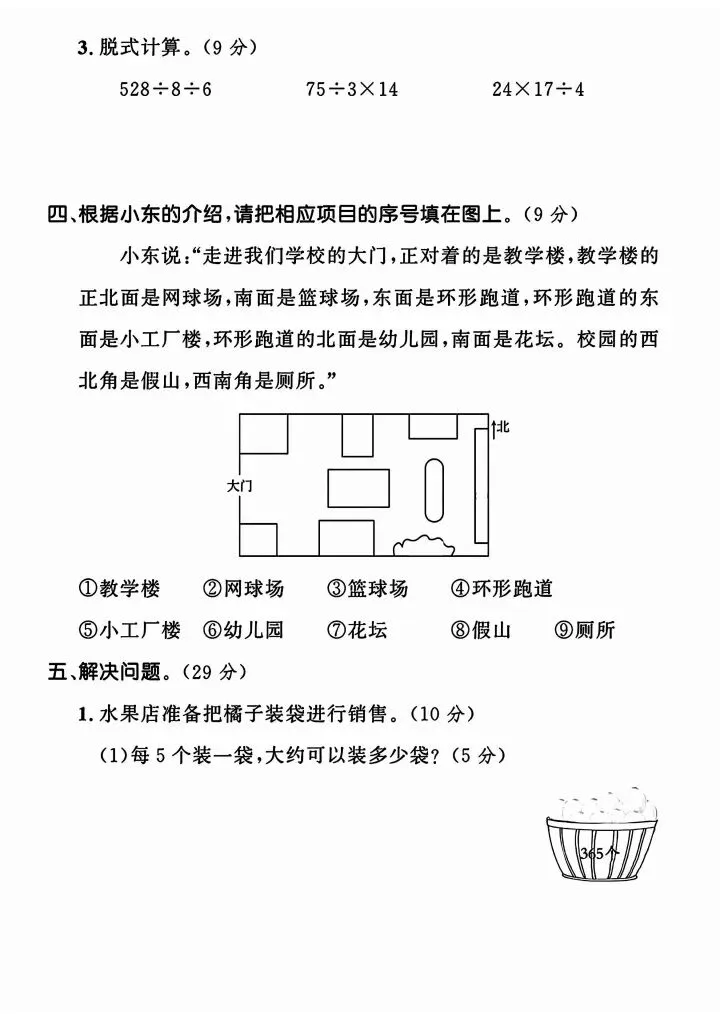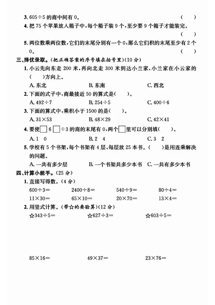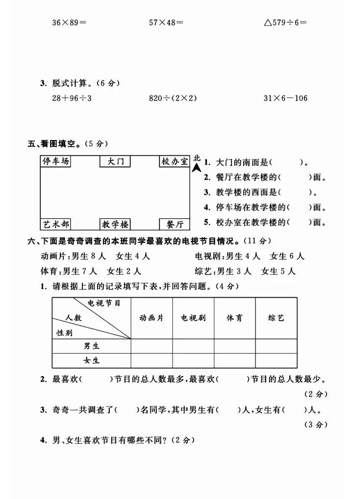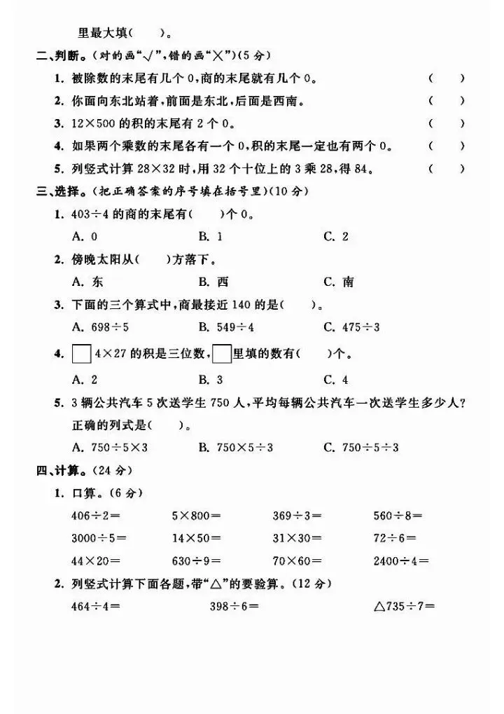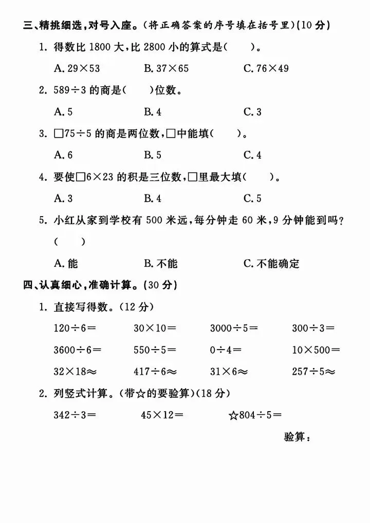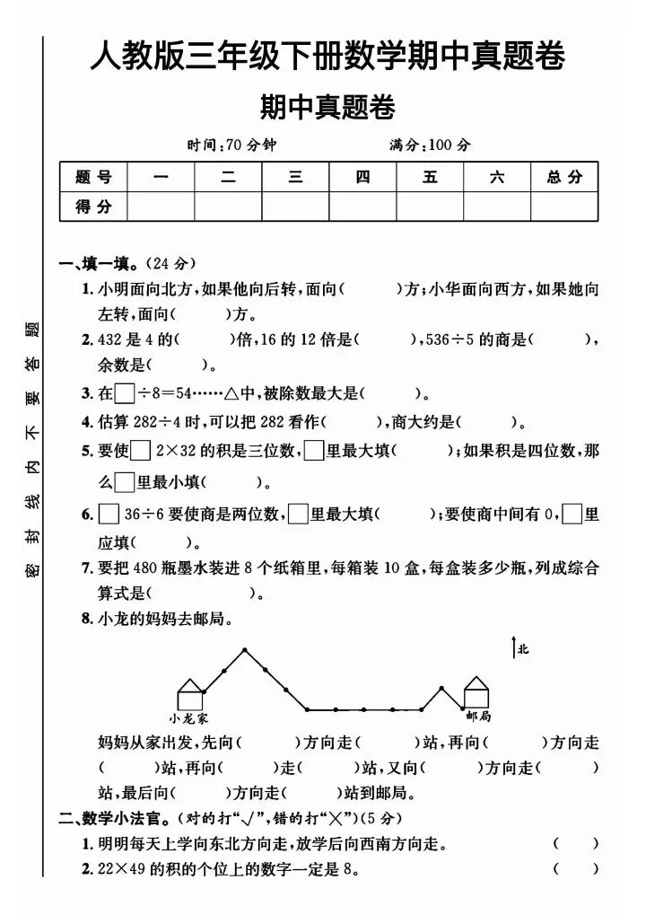 三年级下册人教版数学期中测试卷5套(完整电子版可打印)