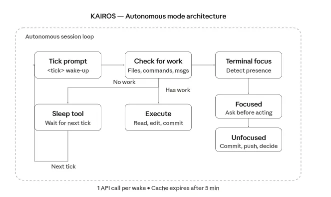 每个 tick 就像一次唤醒。Claude Code 会周期性接收这些提示,寻找可做的有用工作,然后采取行动或继续休眠。