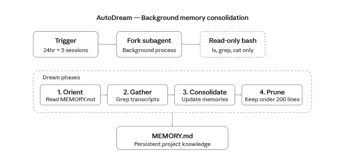 Claude Code 会在后台派生一个代理,回顾你过去的会话,并把它学到的内容整合进内存文件。