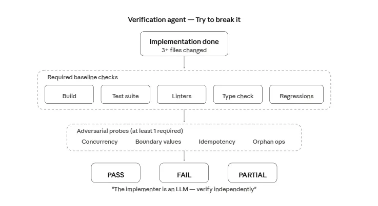 Anthropic 很清楚由 LLM 生成的测试可能会“自证循环”。这个 verification agent 被要求不要轻信。