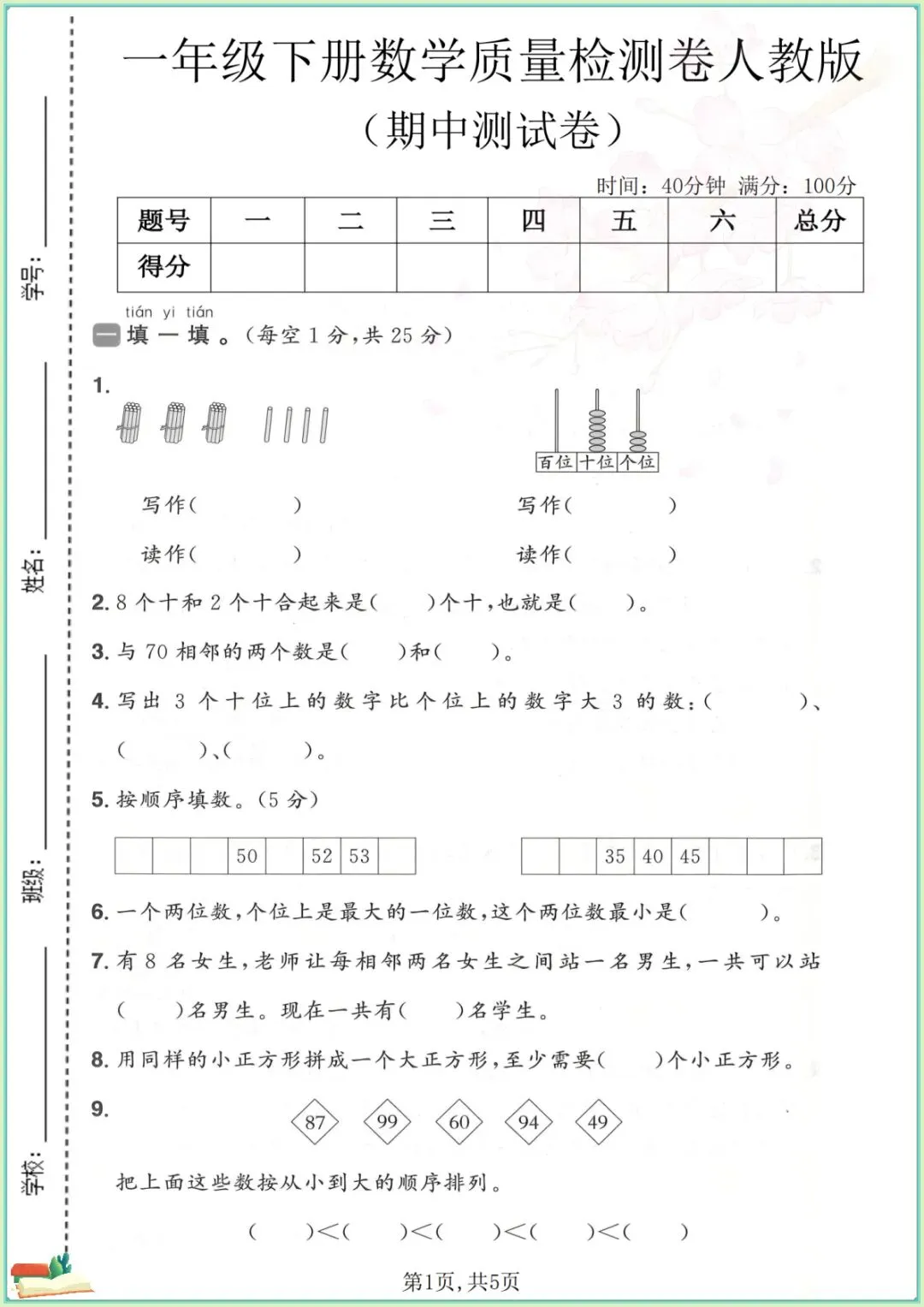 2026人教版一年级下册数学期中卷已整理✅覆盖1-4单元核心考点🌟题型完整、难度适配,可直接打印用于期中复习,帮孩子高效巩固、稳步提分💯