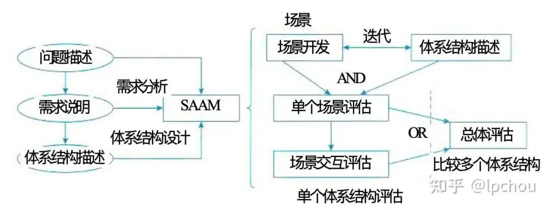 SAAM分析评估架构的过程包括:场景开发、架构描述、单个场景评估、场景交互评估和总体评估