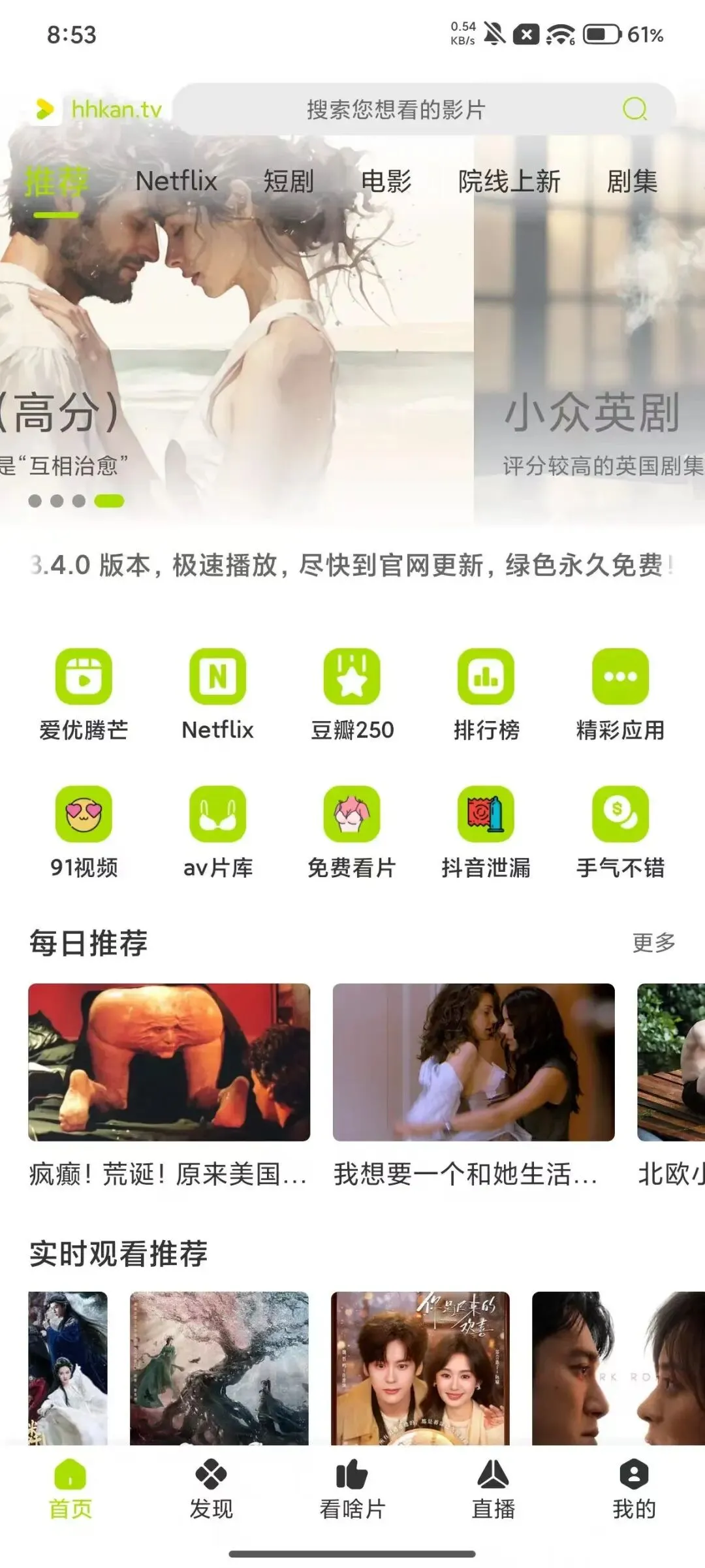 分享一个安卓+苹果+电视+电脑都可以高清观看影视的网站,可分别下载安装 个人用了很久也很稳定的网站,可以下载安卓apk,ios轻量版,电视上也可以安装使用的。 网站链接:https://hhkan.tv https://hhkan.tv 博主自己在安卓以及ios手机端和电视端下载的都有,登录相同账号使用,电视端观看高清线路需要手机端在个人中心点击签到解锁,签到也不需要看广告,只需要手动点击下签到就可以,操作相当简单。APP端还有福利内容。电视端绝对绿色干净没有黄广。 官网下载页: