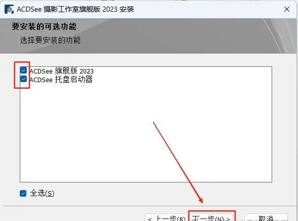 5.勾选【ACDSee 旗舰版 2023】和【ACDSee 托盘启动器】,点击【下一步】。