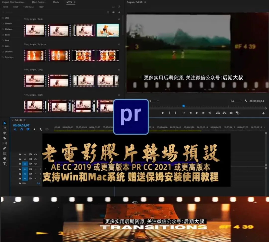 PR老电影插件: 170款复古老电影胶片转场过渡脚本!