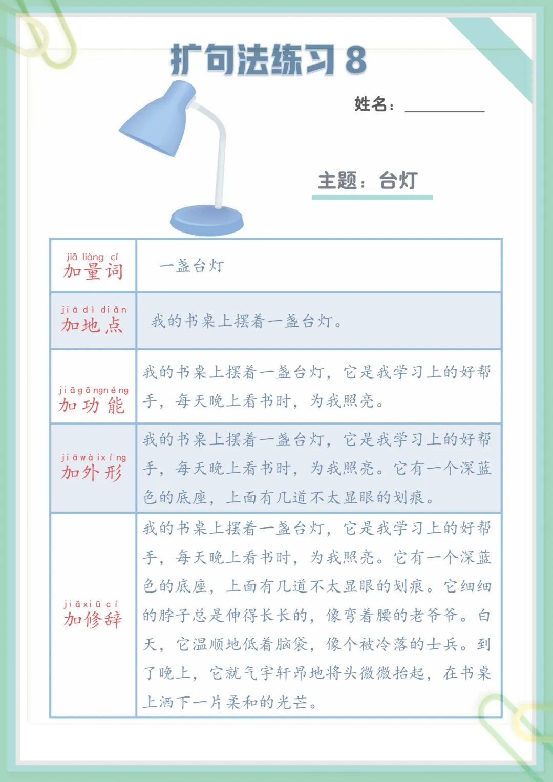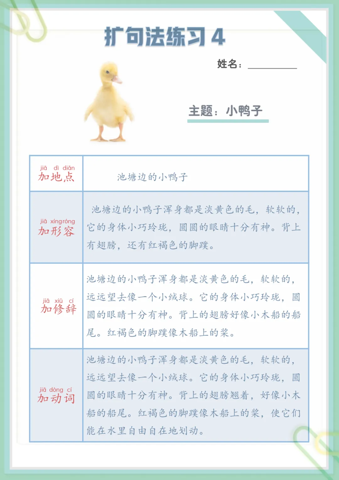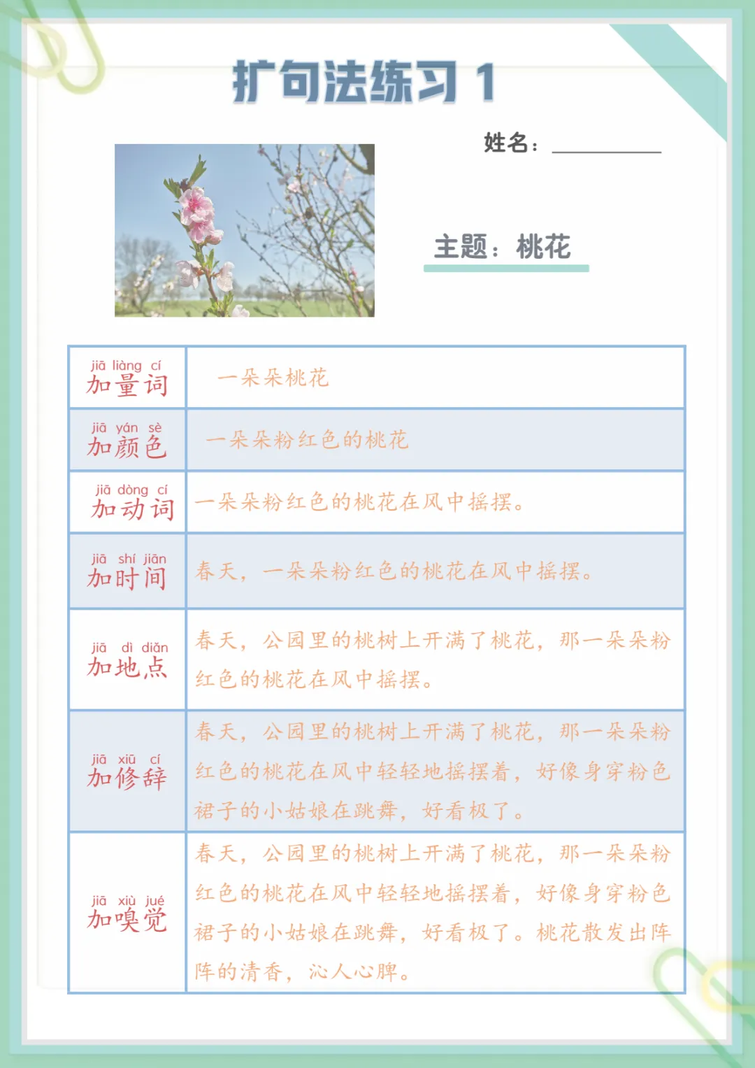 一年级扩句法练习,共20页,电子版可下载可打印,这份资料围绕扩句法专项训练设计,并含空白默写版,方便孩子在练习中逐步掌握把句子写完整、写具体、写生动的方法,进一步提升语言表达与基础写句能力。内容贴合低年级学习需求,适合日常巩固、课后加练和考前复习,帮助孩子扎实打好语文基础。需要的家长可以抓紧保存打印出来,让孩子练一练。