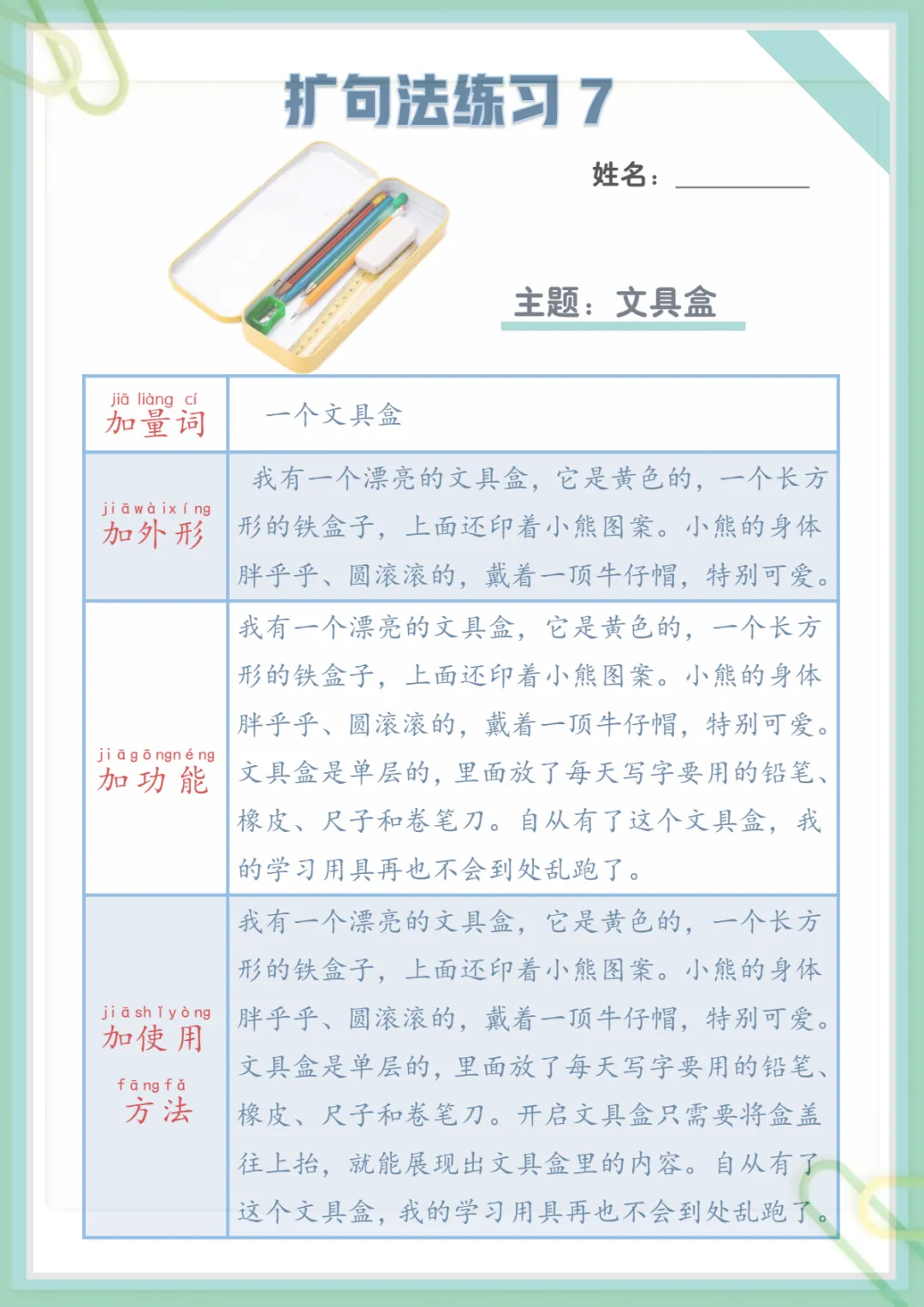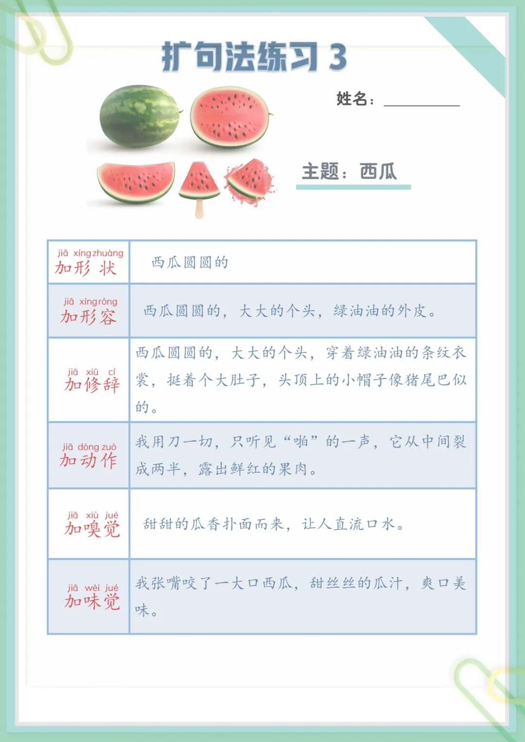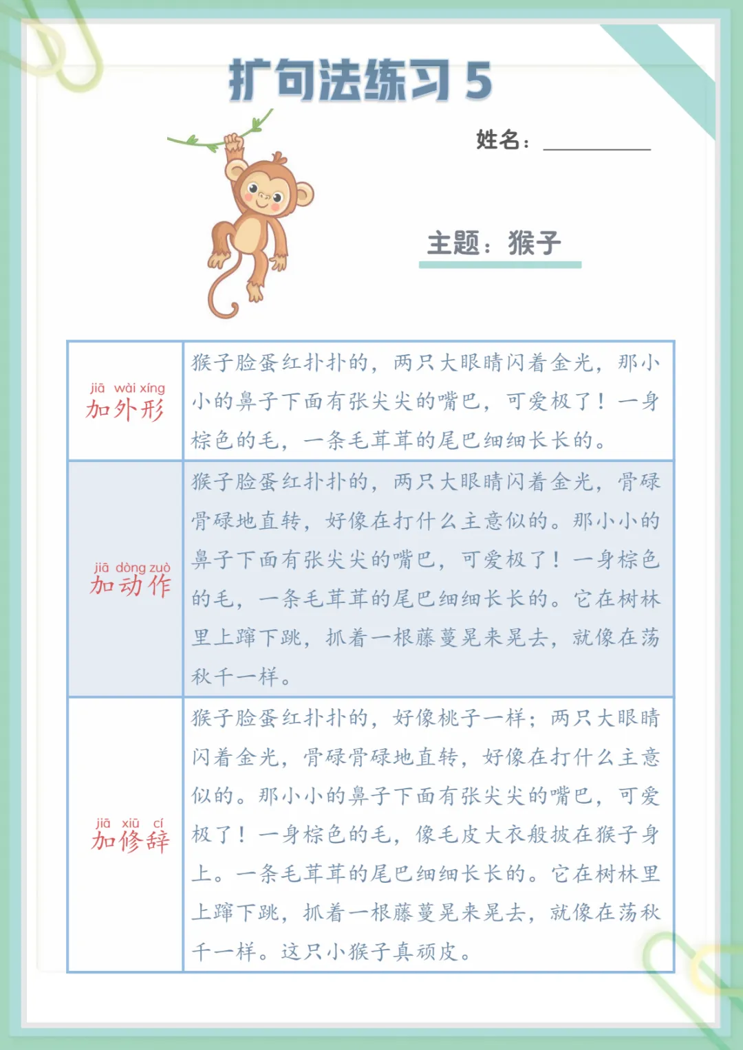 一年级扩句法练习,共20页,电子版可下载可打印,这份资料围绕扩句法专项训练设计,并含空白默写版,方便孩子在练习中逐步掌握把句子写完整、写具体、写生动的方法,进一步提升语言表达与基础写句能力。内容贴合低年级学习需求,适合日常巩固、课后加练和考前复习,帮助孩子扎实打好语文基础。需要的家长可以抓紧保存打印出来,让孩子练一练。