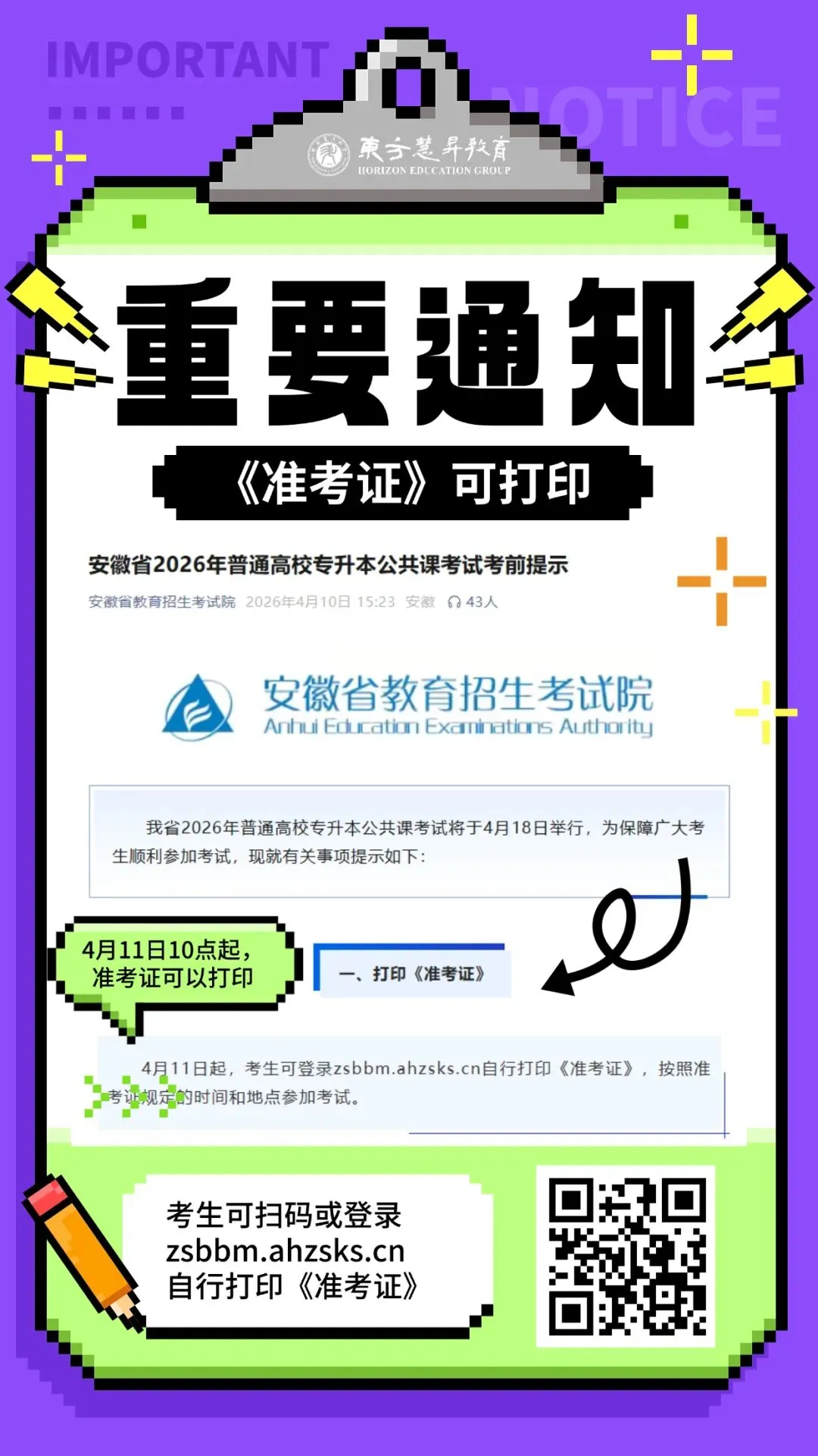 4月11日起,考生可登录zsbbm.ahzsks.cn自行打印《准考证》,按照准考证规定的时间和地点参加考试。