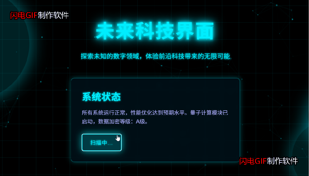 <!DOCTYPE html><htmllang="zh-CN"><head><metacharset="UTF-8"><metaname="viewport"content="width=device-width, initial-scale=1.0"><title>黑色科技感背景</title><linkhref="css.css"rel="stylesheet" /></head><body><divclass="grid"></div><canvasclass="particles"id="particles"></canvas><divclass="glow-elements"><divclass="glow-element element1"></div><divclass="glow-element element2"></div><divclass="glow-element element3"></div></div><divclass="container"><h1>未来科技界面</h1><pclass="subtitle">探索未知的数字领域,体验前沿科技带来的无限可能</p><divclass="tech-card"><h2>系统状态</h2><p>所有系统运行正常,性能优化达到预期水平。量子计算模块已启动,数据加密等级:A级。</p><buttonclass="btn">启动深度扫描</button></div></div><scriptsrc="js.js"></script></body></html>