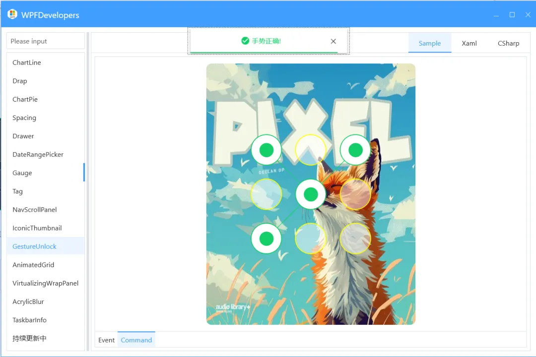 事件 GestureCompleted命令GestureCompletedCommand双通道通知解锁结果;