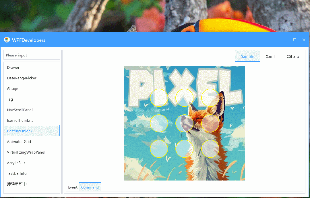 <TabControlTabStripPlacement="Bottom"><TabItemHeader="Event"><wd:GestureUnlockx:Name="myGestureUnlock"wd:ElementHelper.CornerRadius="5"GestureCompleted="GestureCompleted"><wd:GestureUnlock.Background><ImageBrushImageSource="pack://application:,,,/WPFDevelopers.Samples;component/Resources/Images/Chat/Right.jpg" /></wd:GestureUnlock.Background></wd:GestureUnlock></TabItem><TabItemHeader="Command"><TabItem.Resources><StyleBasedOn="{StaticResource WD.GestureItem}"TargetType="wd:GestureItem"><SetterProperty="BorderBrush"Value="Yellow" /></Style></TabItem.Resources><wd:GestureUnlockx:Name="myGestureUnlock2"Width="400"Height="500"wd:ElementHelper.CornerRadius="10"GestureCompletedCommand="{Binding GestureCompletedCommand}"><wd:GestureUnlock.Background><ImageBrushImageSource="pack://application:,,,/WPFDevelopers.Samples;component/Resources/Images/IconicThumbnail/LcupqA.jpg" /></wd:GestureUnlock.Background></wd:GestureUnlock></TabItem></TabControl>