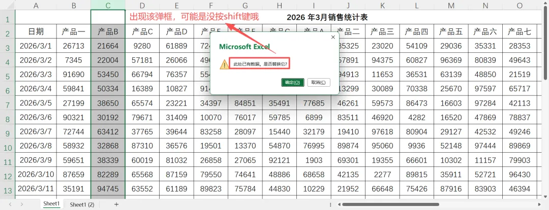 提示一:若操作过程中出现弹框提示“已有数据,是否替换”,可能是没有按Shift哦。