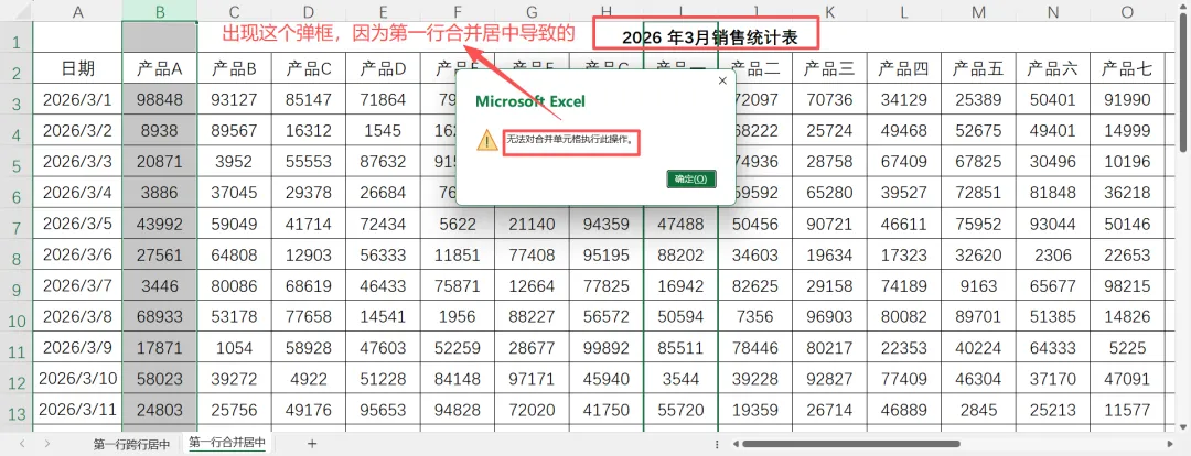 提示二:若操作过程中出现无法对合并单元格执行此操作,那可能是因为有合并居中单元格导致的,需要先取消合并居中。