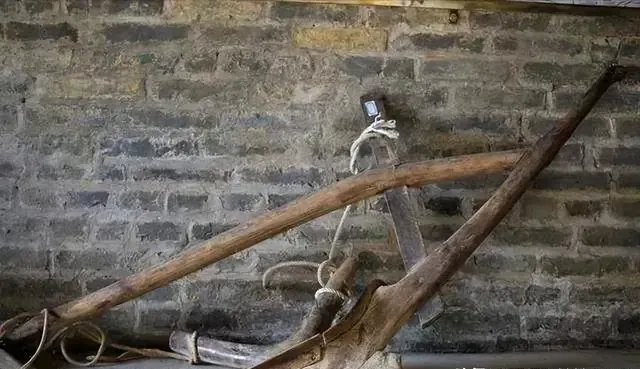 这件木头和铁件连在一起的,像老犁头。以前种地,春耕是头等大事,犁头往牛身上一套,人扶着,牛在前头慢慢拱,犁铧翻开土,一垄一垄往前走。