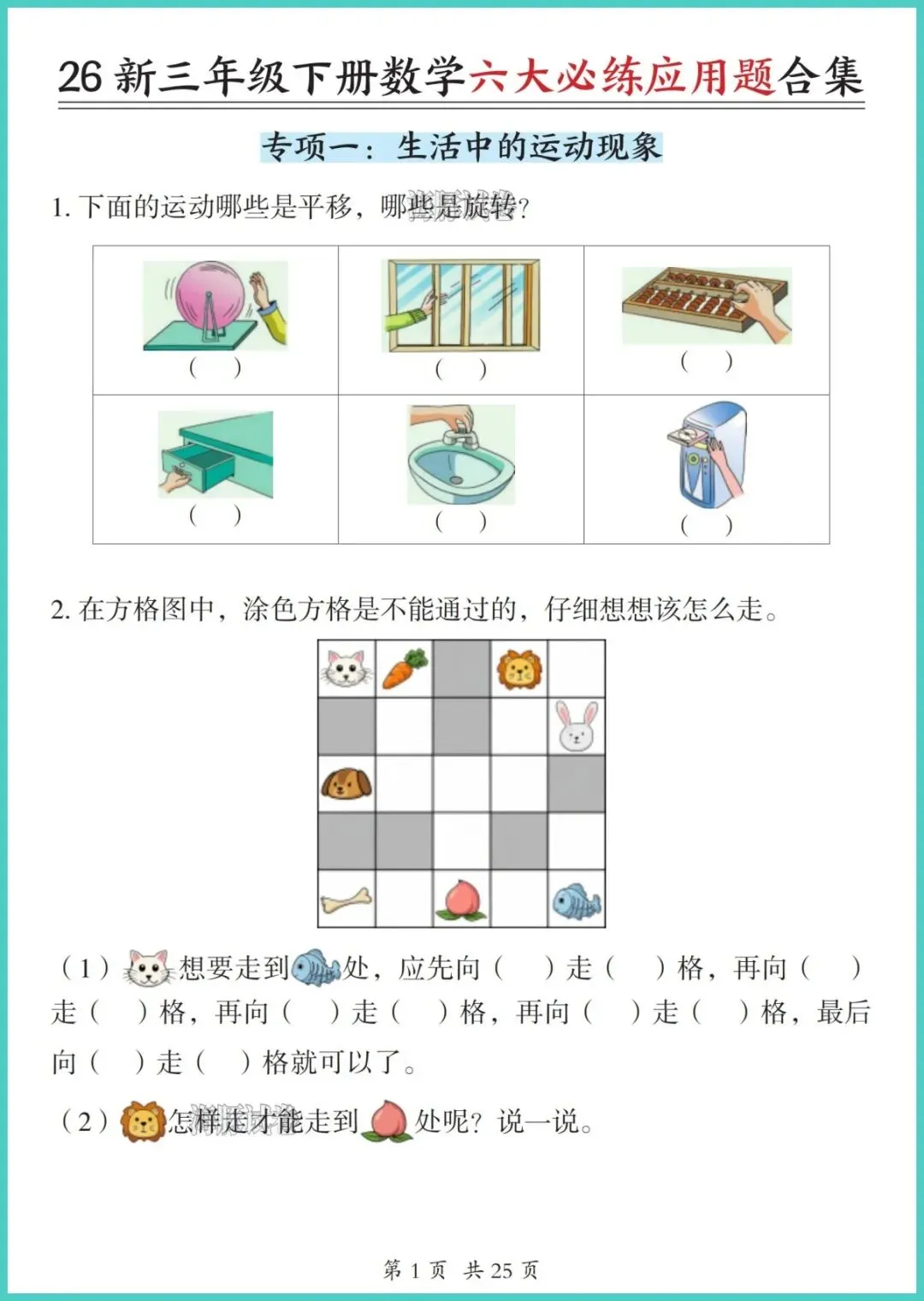 2026春人教版三年级下册数学《六大必练应用题合集》新鲜出炉!25页精选压轴题,专为三年级娃量身打造。六大模块:路程、买卖、倍数、面积、时间、统筹,一网打尽;每题配思路图解分步答案,帮孩子秒懂题眼,拒绝“一听就会、一做就废”。每天练两页,考试遇到应用题不再发怵,信心与分数同步飙升!想让孩子数学冲刺满分?赶紧打印出来,娃提分就靠它!