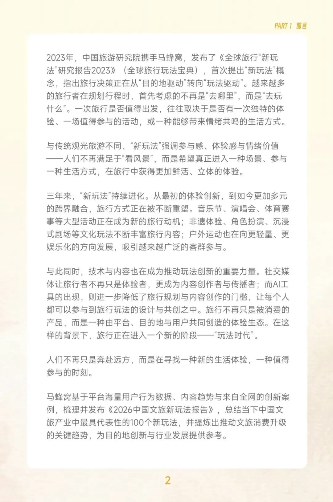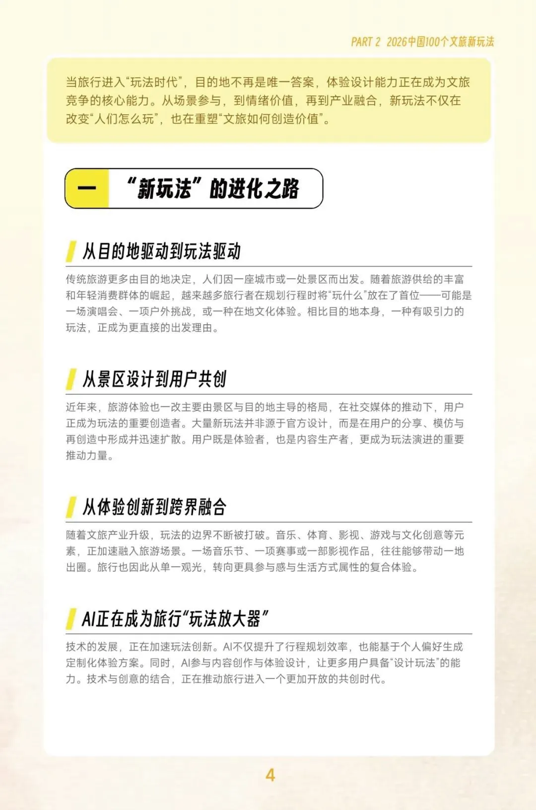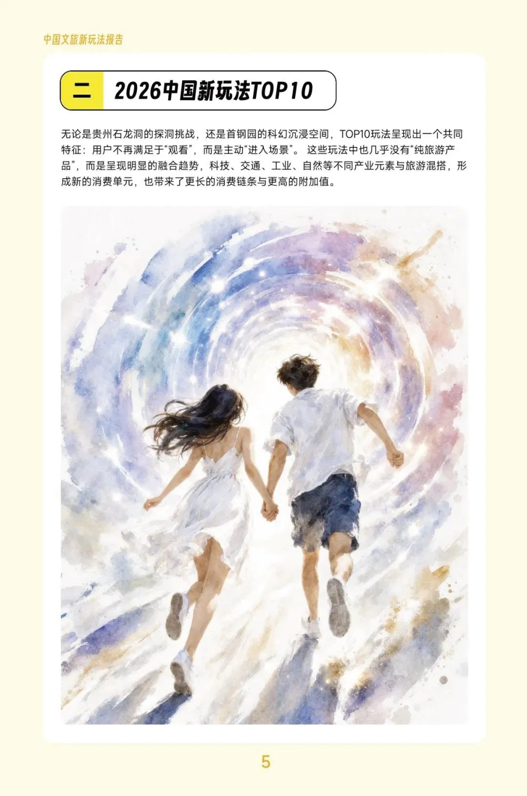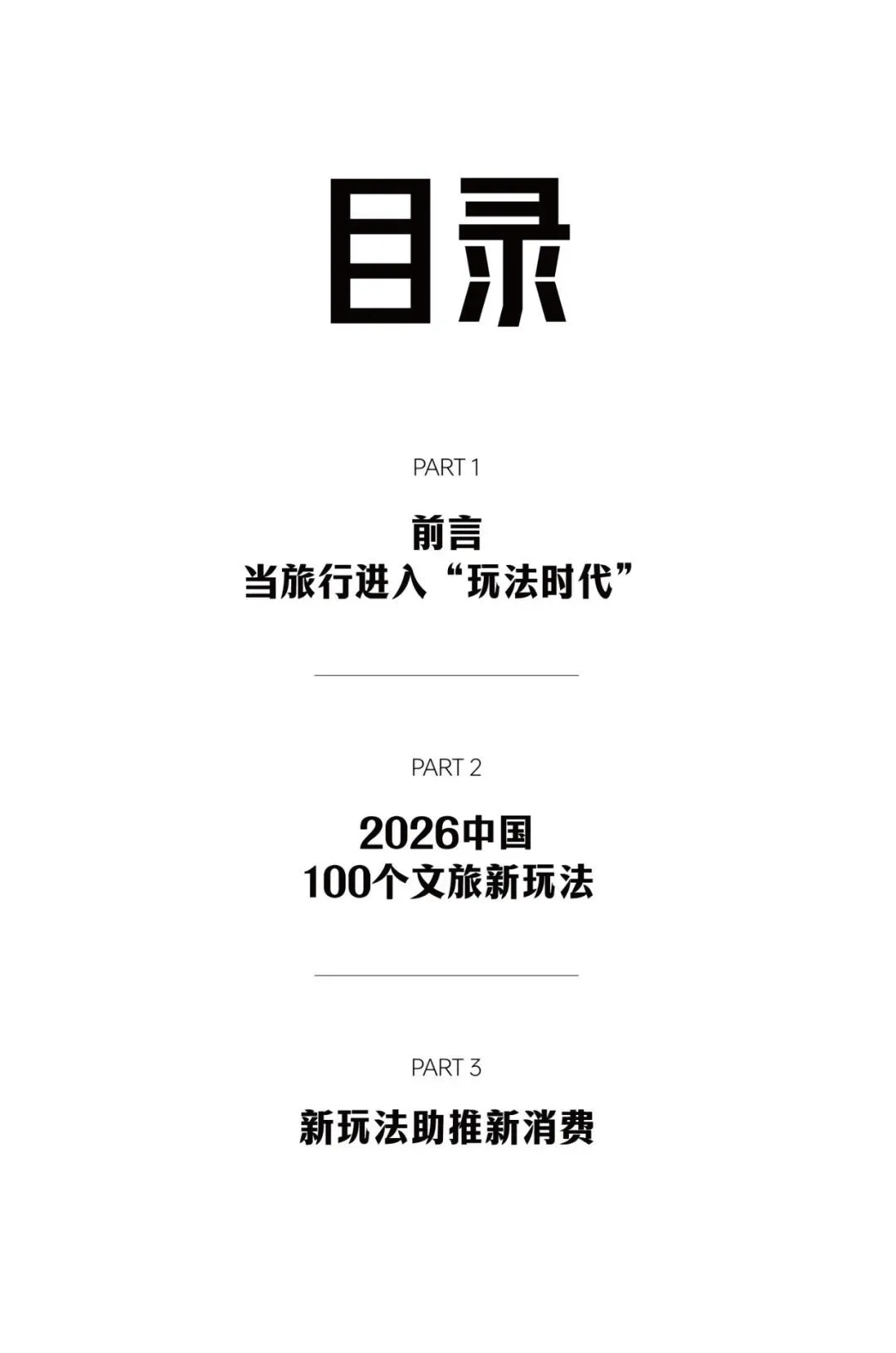 2026中国文旅新玩法报告(可下载) ——核心内容◆ 部分展示 ◆ 资料下载 —— ▼ 当旅行进入“玩法时代”,目的地不再是唯一答案,体验设计能力正在成为文旅竞争的核心能力。从场景参与,到情绪价值,再到产业融合,新玩法不仅在改变人们怎么玩,也在重塑”文旅如何创造价值“。 —— 核心内容◆ 部分展示 ◆ 资料下载 —— ▼ —— 核心内容◆ 部分展示 ◆ 资料下载—— ▼ 直接戳“阅读原文”下载 ▼ 往期热门推荐 清华大学《DeepSeek从入门到精通》 丨 清华大学《DeepSeek 如何赋能职场应用?》 丨 清华大学《普通人如何抓住DeepSeek红利》 丨 bilibili 十五大特色人群白皮书丨微信朋友圈高价值人群研究 丨 2024抖音电商年度报告 丨 新茶饮年度盘点 丨 2025消费趋势及增长策略洞察 丨 2024-2025节日营销趋势 丨 2025年视频号中老年用户消费洞察 丨 5个值得收藏的年度演讲PPT 丨 社交趋势 丨 抖音电商年度增长报告 丨 TikTok Shop 2024年度数据报告 丨 2024抖音热点年度数据 丨 周鸿祎:2025年赚钱7大风口 丨 小红书5900万质享人群白皮书 丨 疗愈经济 丨 2024电商消费趋势年度报告 丨 2024小红书「十大生活方式」洞察 丨 2025私域人才需求与薪酬 丨 年轻人10大兴趣社交 丨 消费者展望 丨 情绪经济 丨 微信内容种草 丨 大家电 丨 2024最全双11数据报告 丨 酒水 丨 汽车 丨 微短剧 丨 《中国统计年鉴2024》 丨 万亿银发经济 丨 小家电 丨 2024小红书趋势及品牌玩法拆解 丨 青年消费 丨 2023-2024年小红书全行业月报(325份)