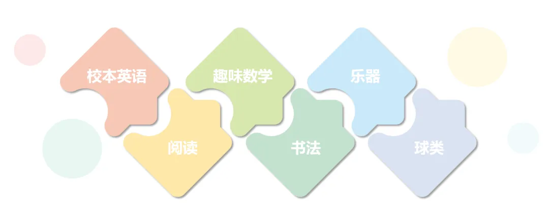 每周一至周五下午5:00-6:00,开设包含作业辅导、体育运动、艺术、信息科技等多元化拓展课程供孩子自愿选报,丰富课后生活,让孩子享受自主学习的乐趣。