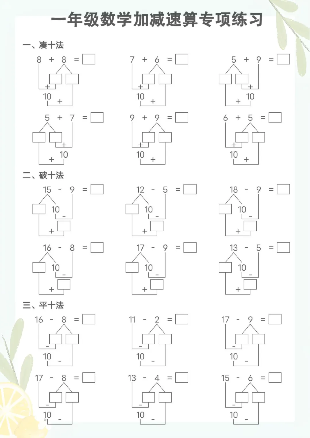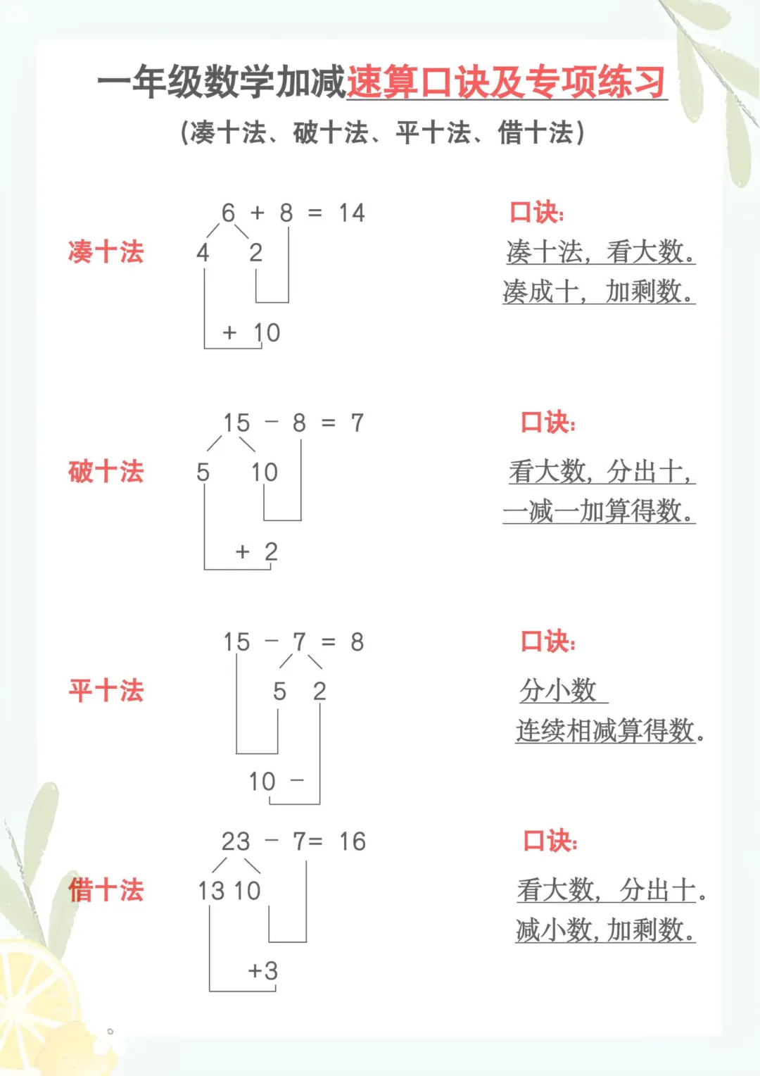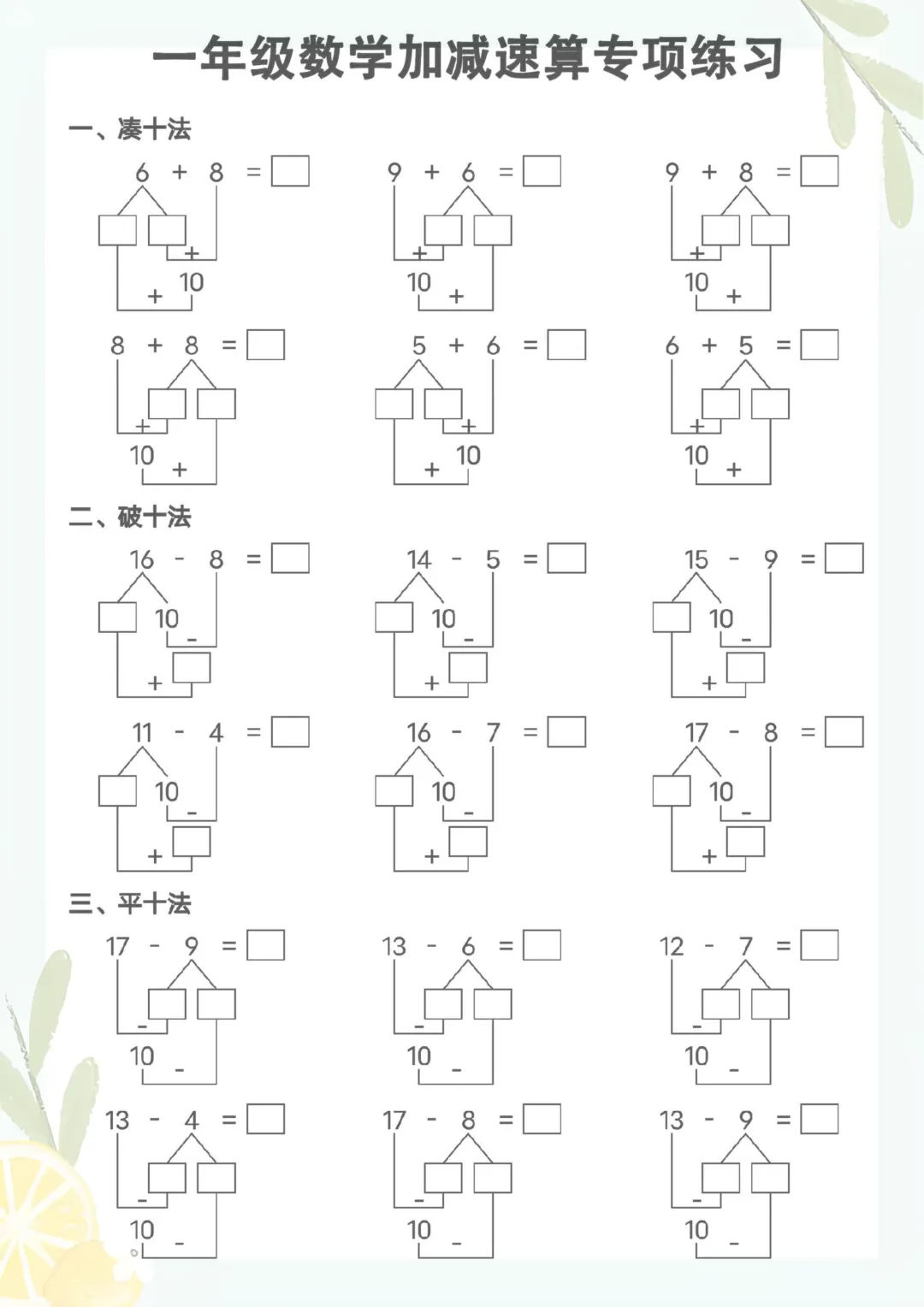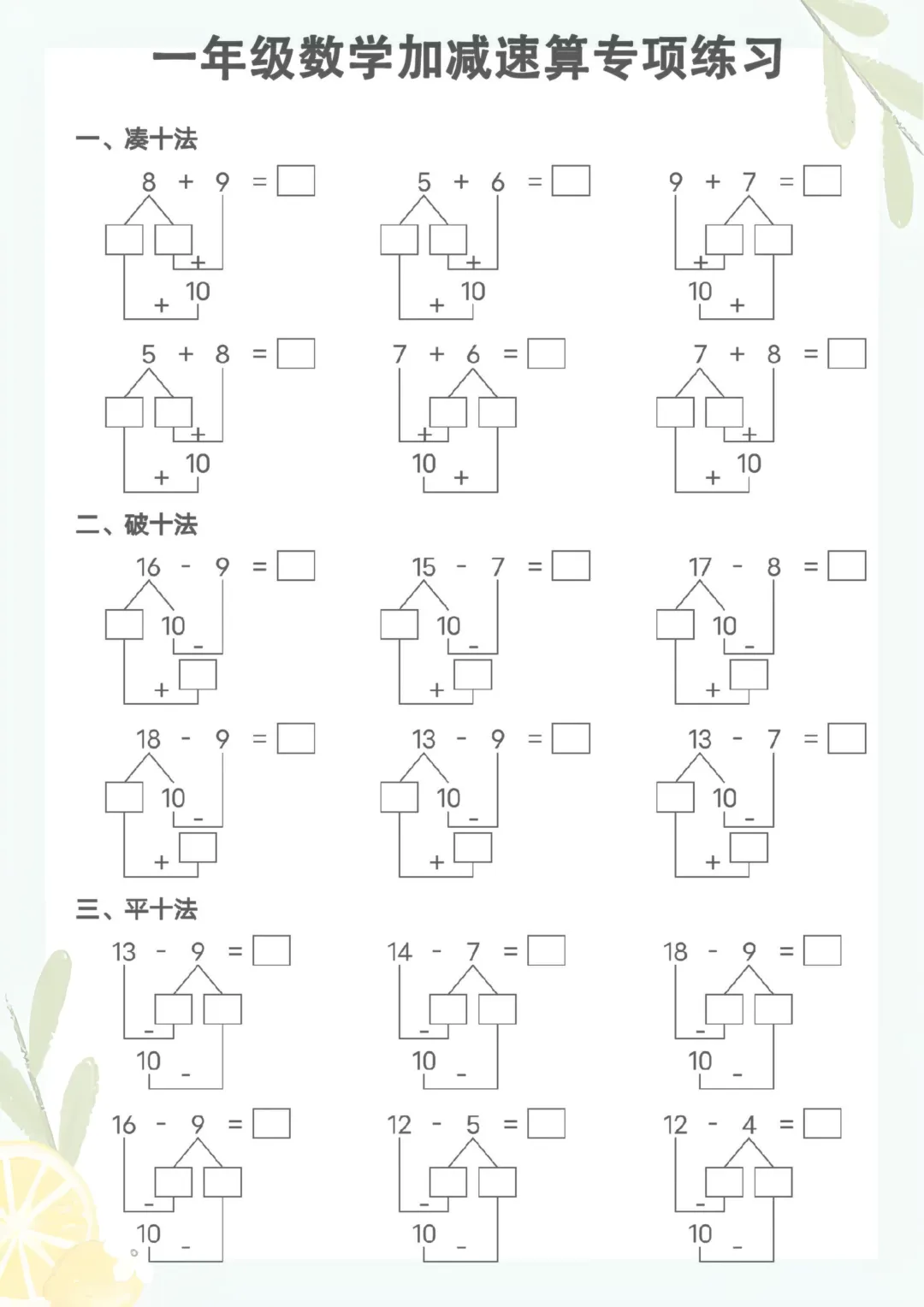 一年级下数学速算口诀及专练,共4页,电子版可下载可打印,这份资料围绕一年级下册数学速算训练整理了实用口诀与对应专练内容,帮助孩子在练习中提升计算速度与准确率,进一步巩固口算基础与解题思路,适合家长日常在家配合学习使用。内容精炼、针对性强,需要的家长可以抓紧打印出来,让孩子及时练一练。
