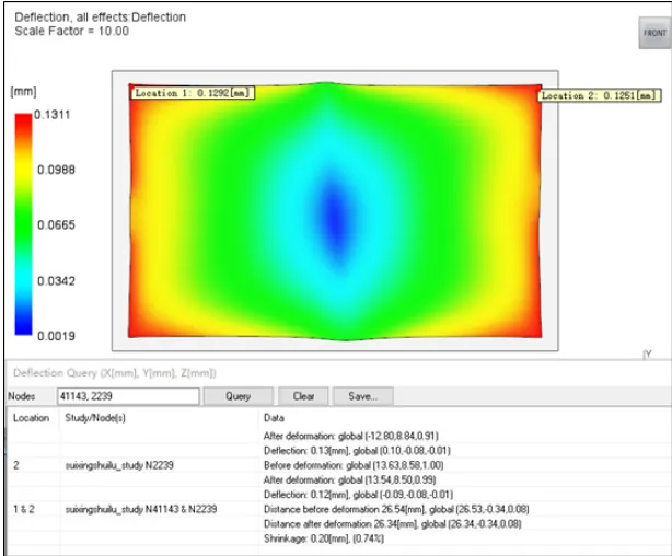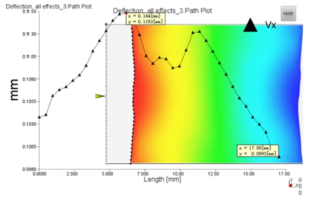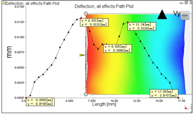 用路径图叠加阴影图显示的方式然后基于锚平面的放大变形比例我们看到,从上往下,产品变形趋势是整体内凹,且呈现双峰内凹的变形趋势,峰值变形量大约是0.0131mm。该方式是确定产品单边变形的最佳的查看方式。