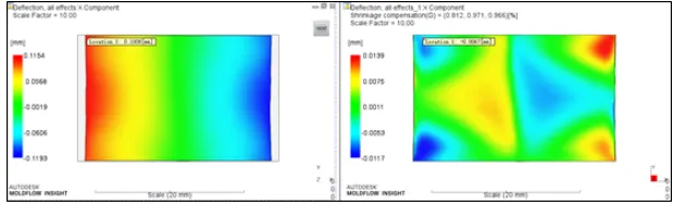 从图3中我们可以看到,左侧没有收缩补偿所得的结果是用该值与产品的“原始外形轮廓”的对比,该值包含了正常收缩的部分。右侧有收缩补偿的对比是用该值与产品的“设计尺寸”进行对比,与“设计尺寸”对比偏差了多少,直接测量出来的数据可以作为判断装配间隙大小的尺寸,从来确定该收缩或者形变对于装配后的间隙影响有多大!所以这个方式也是大多数终端客户期望看到的结果。但是对于Moldflow工程师来讲,为了优化产品的翘曲有没有收缩补偿都一样,往往我们更加喜欢直接的带有收缩的结果来看翘曲变形的趋势,因为在比例放大的情况下,该趋势会更加直观和明显。