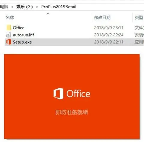 2、将其解压出来,放在G盘根目录下,d盘,e盘都行,关键是解压出来,不要用虚拟光盘加载。另外不能是中文目录,比如小编解压到G:\proplus2019retail即可,中文目录会出未知错误;再双击setup.exe开始安装,