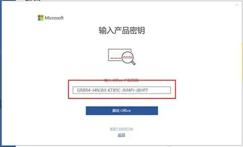 7、弹出输入office产品密钥,再输入office2019激活密钥【GRBR4-J4N3M-KTX9C-JM4PJ-J8HPT】,