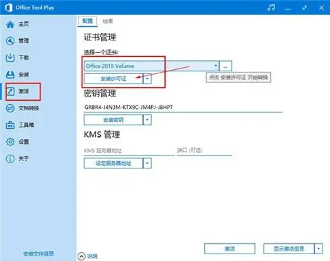 11、选择激活栏,选择一个证书“office 2019 volume”再点击安装许可证,
