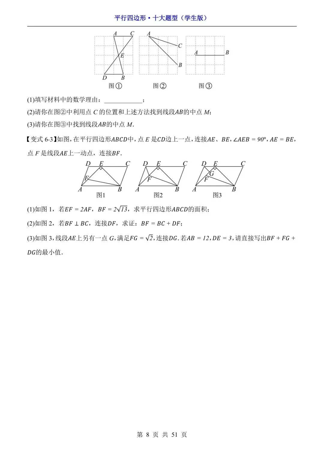 八下数学平行四边形-十大题型(可下载打印) 资源下载见图片底部 资源介绍 电子版PDF文档 网盘下载链接详见页面底部 ▼内容预览▼ 版面所限,此处仅展示部分内容 完整版电子版👇 获取完整电子版方式 👇 点击下方卡片关注 进入“瑶瑶妈妈爱学习”的后台 发送消息 资料下载 获取打印电子版方式 重要说明 版权声明: 本公众号分享的资源,所有文件版权归原作者所有,如有侵权可以联系本人删除。本公众号尊重版权,有任何版权问题,可以直接在公众号留言,我看到后会回复。