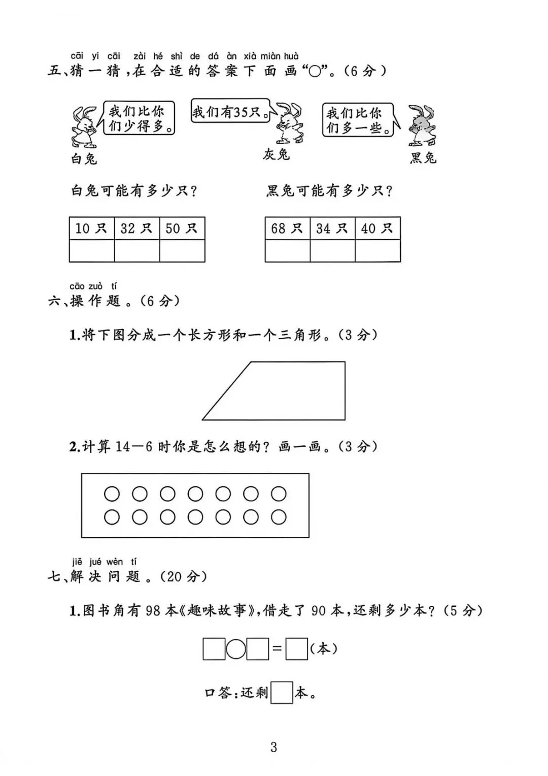 人教版一年级下册数学期中测试卷4套,电子版可打印