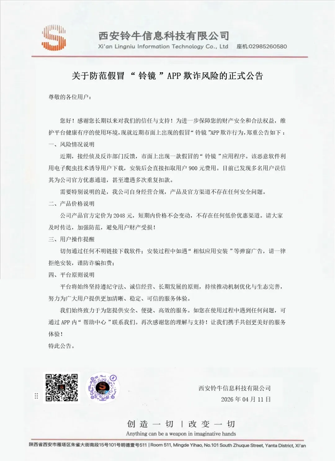 关于防范假冒“铃镜”APP欺诈风险的正式公告