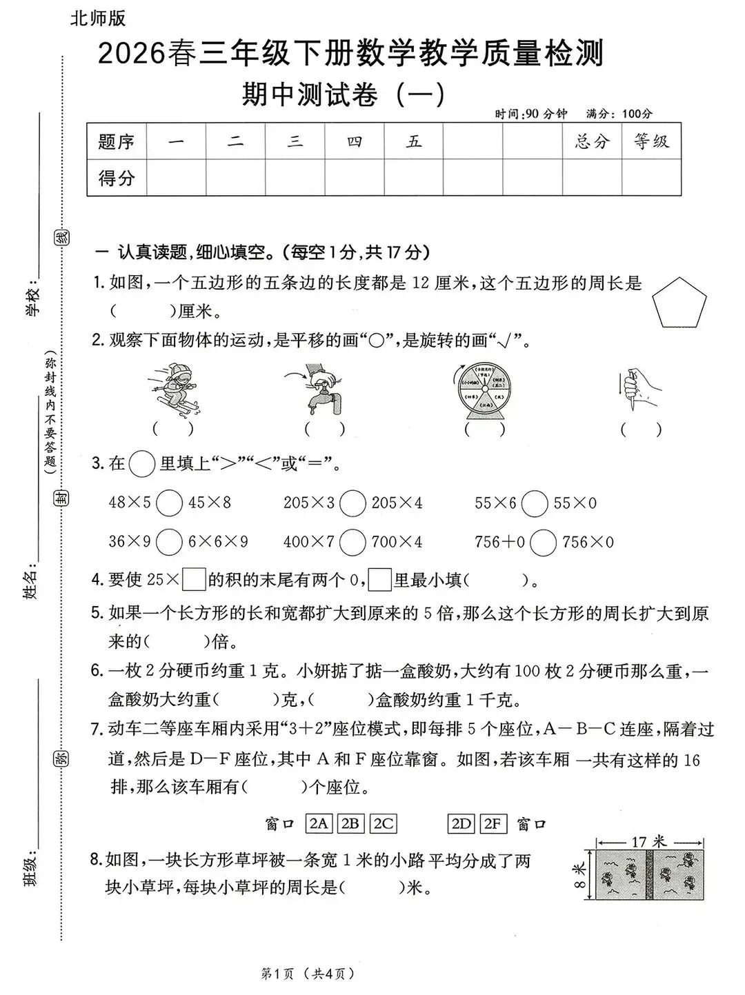 2026春北师大版小学三年级下册数学【期中考试测试卷】含答案共5套(可打印)