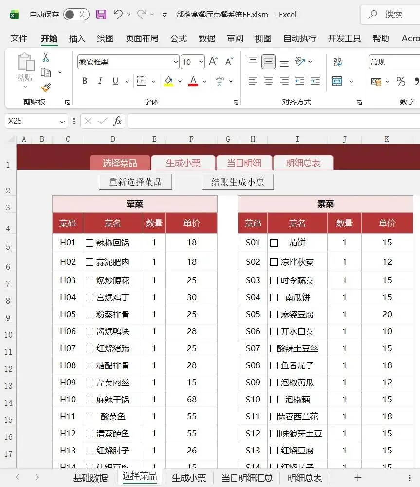 👉 菜品按类别分栏:荤菜 / 素菜 / 小吃 / 饮料👉 每道菜都有菜码、菜名、单价👉 勾选后自动带出信息,点菜超快