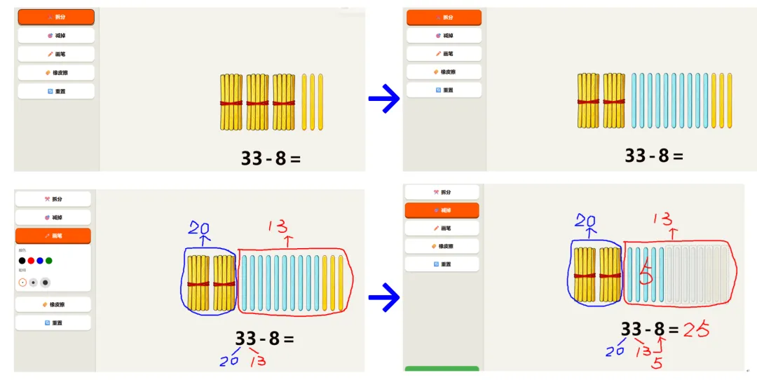 第三步,反馈展示:打开“习题AI小助手”,请有“破十”想法的学生代表上台操作(点击“拆分”选项)。→理解算理:1.小棒由3个十和3个一变成了2个十和13个一(学生用“画笔”工具批注)。2.先算13-8=5,再算20+5=25(使用“减掉”和“画笔”功能)