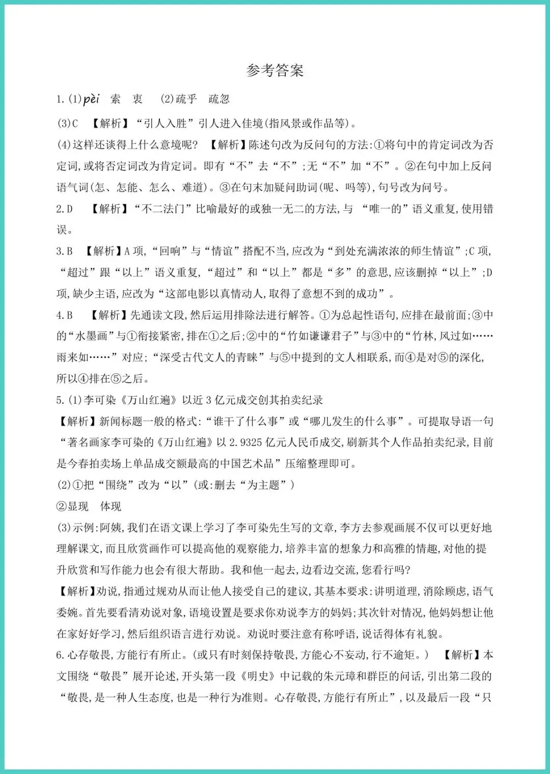 24春统编版九年级下册语文《练习题14·山水画的意境》共6页,电子版高清可打印!这份练习紧扣课文,从字词积累、句段赏析到意境探究,层层递进,附思维导图答案示范,帮孩子秒懂“情景交融”,赏析题不丢分,写作也能借“山水”添诗意。初三时间紧,刷它就够!需要的家长快打印,让孩子睡前练一页,考场多拿几分!