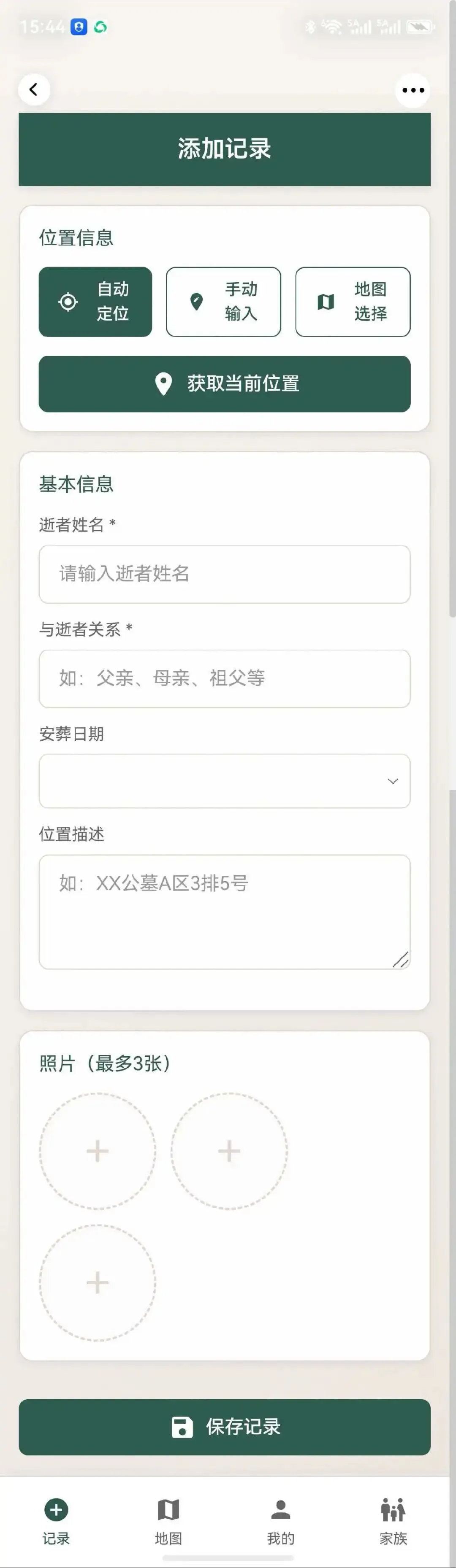 位置信息支持自动定位、手动输入、地图选择三种方式。逝者姓名、关系、安葬日期、位置描述都能填。最贴心的是可以上传最多三张照片——墓碑、周边环境、路线标记,一目了然。