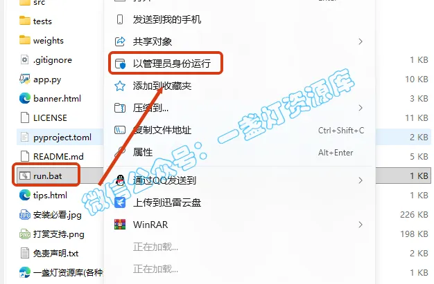 2.打开解压的文件夹,右键【run】选择【以管理员身份运行】