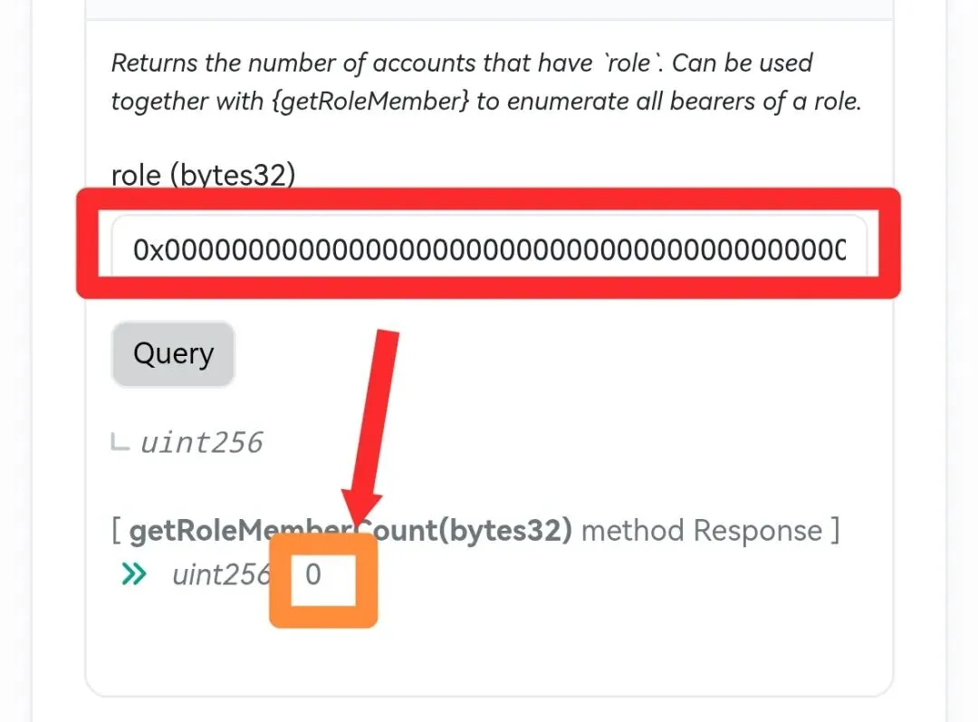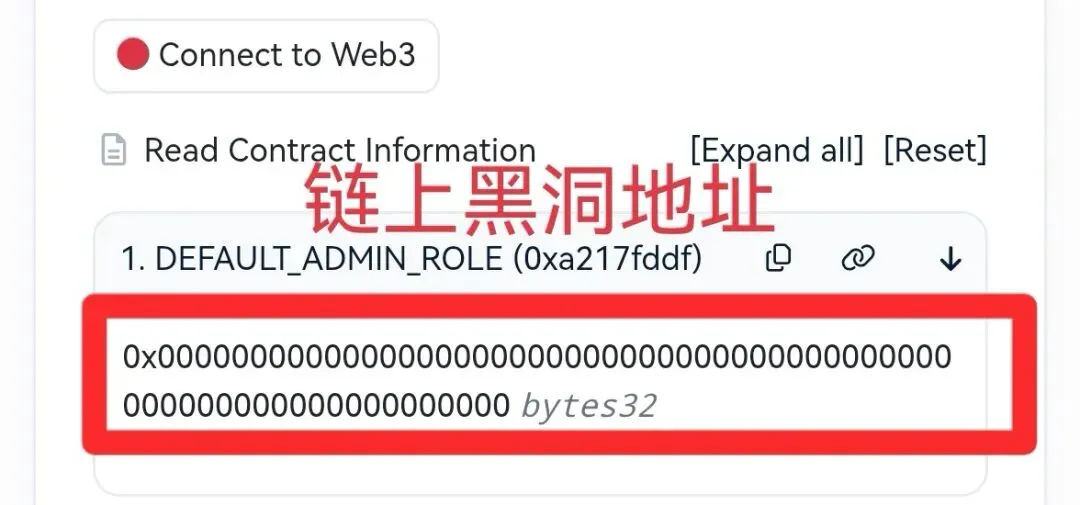 我们检查管理员权限,发现这是一个0X开头的64位全零哈希值的黑洞地址