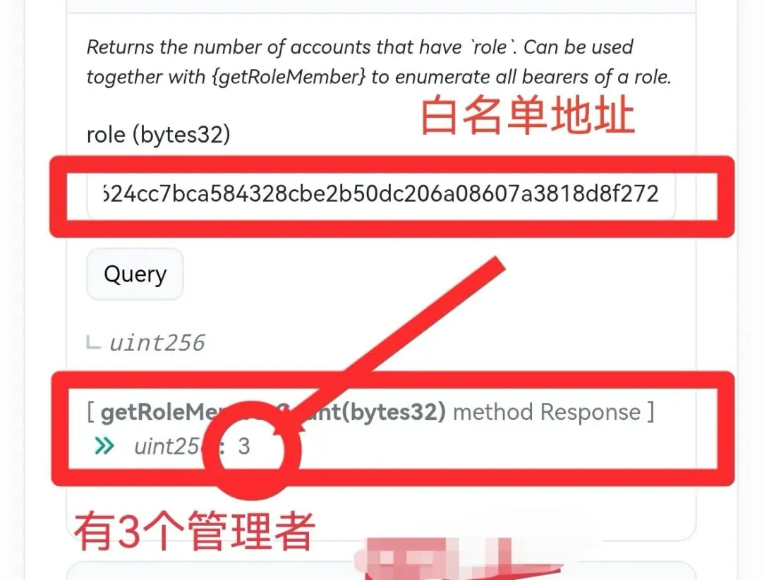接下来看第三项白名单查询,白名单相当于外交豁免权,特别通行证,就是看谁在DeFi里拥有特权,比如无税套利、资产转移、参与控盘等。查询的结果,我们看到白名单背后有3个管理人。