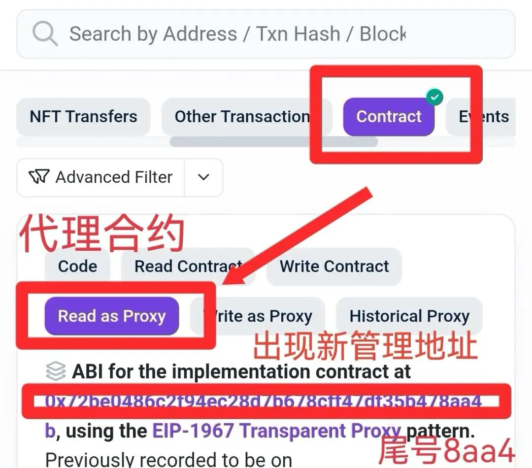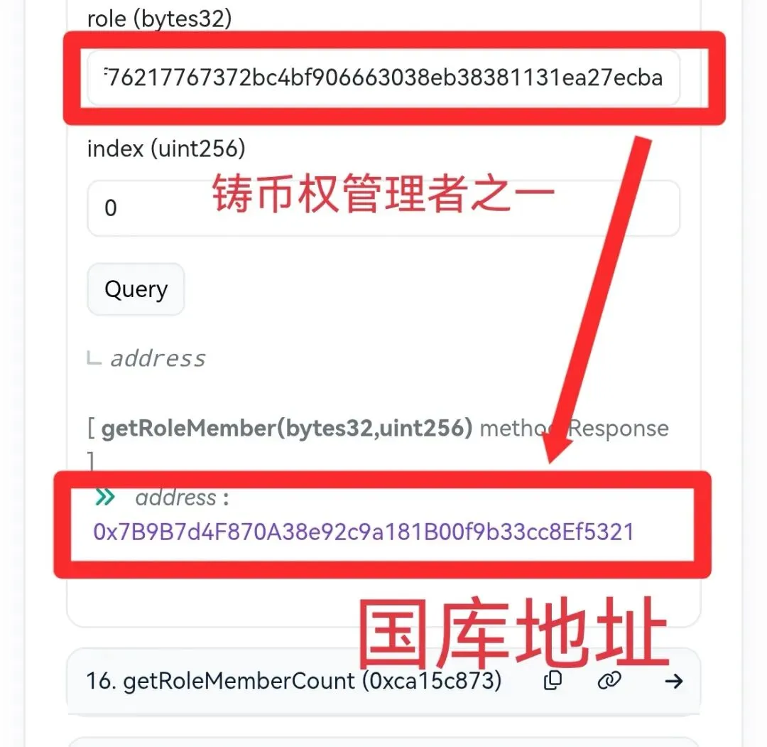 得到一个代理合约地址。什么意思呢?我做个比喻方便你理解。现在你和别人发生了财务纠纷,对方不出面,找来代理律师和你对簿公堂,这位代理律师就相当于代理合约。读取这个代理合约,看到紫色的这个钱包地址就是律师背后的那个人。这说明铸币权除了国库合约,还有另外一个人可以掌控。