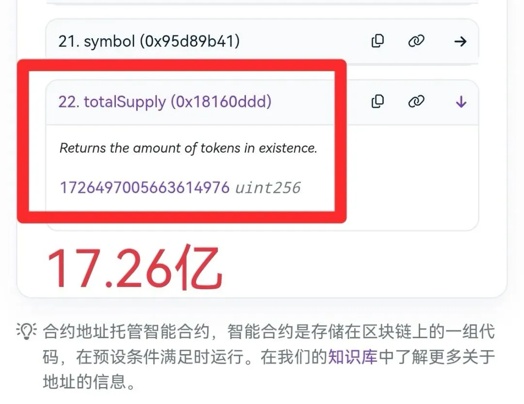 那么有没有超发代币呢?想验证这一点,我们去最后面第22项合约,点击一下代币总量,显示出来17.26亿
